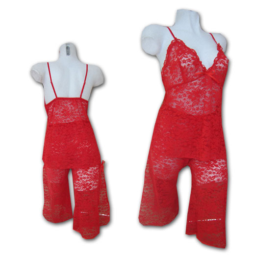 Nuisette pantacourt + caraco dentelle strech fleurs sur résille. brides velours réglables. Pantacourt élastiqué à la taille et ouvert sur les côtés. 3 tailles.
