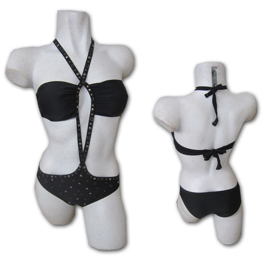 Trikini bandeau rembourré fin. 2 bandes cloutées entrecroisées à l'avant. Slip entièrement doublé. Attache cou. 4 tailles (42->48)