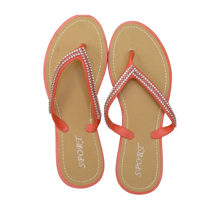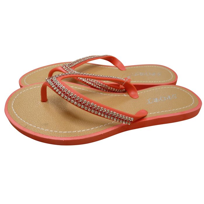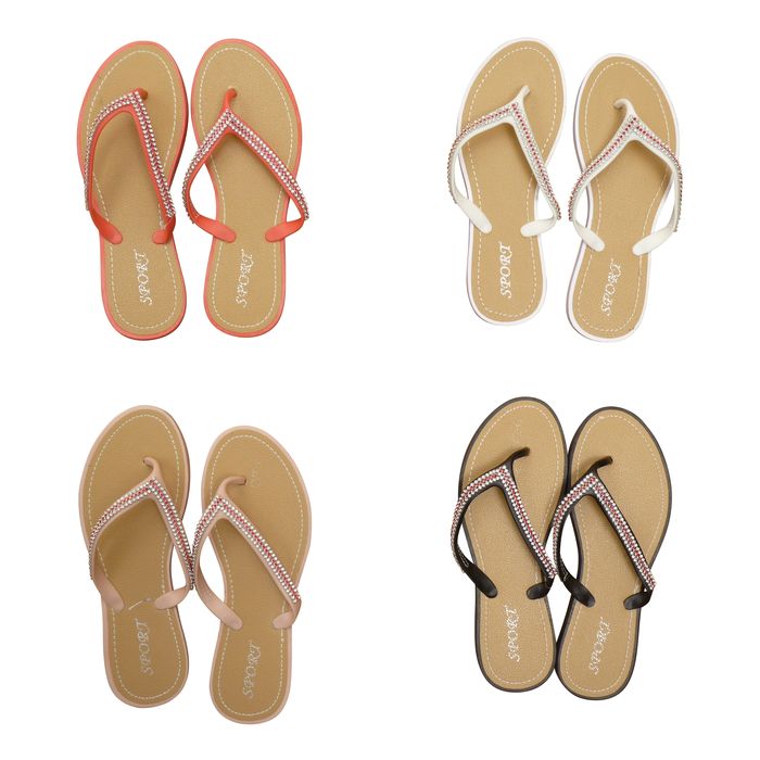 Tong semelle intérieure inscription "Sport". Semelle extérieure antidérapante. Brides caoutchouc ornées de strass. Semelle rigide. 6 tailles, 4 couleurs, diamant sur la lanière.