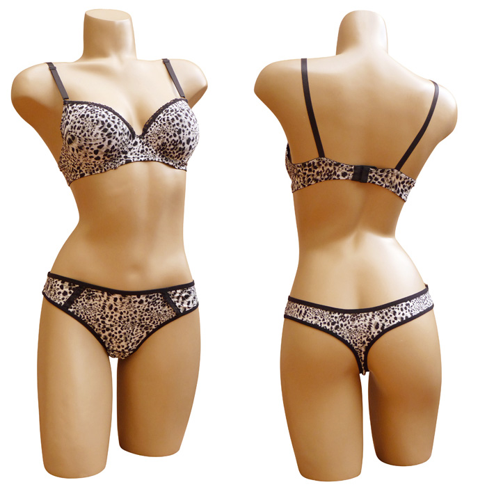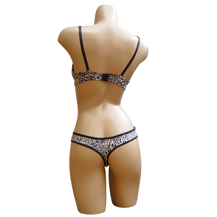 Ensemble soutien gorge tanga. Voile stretch motif léopard rehaussé par fine dentelle "fleurs" sur la partie supérieure du bonnet. Soutien gorge rembourré avec armatures. Bretelle ajustable et non amovibles. Liseré uni sur le pourtour des cuisses et de la taille avec rappel dentelle contrasté à l'avant du tanga. Bonnet B. 5 tailles dont 95 en double.