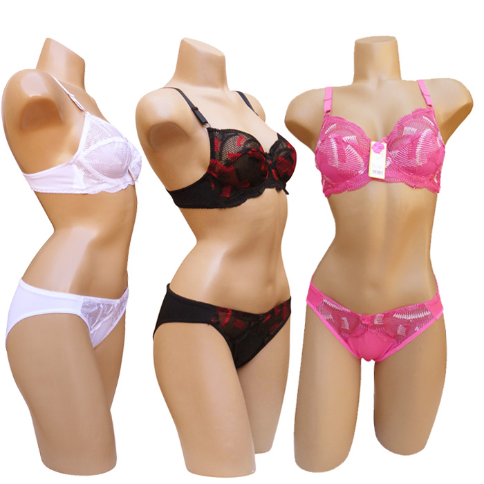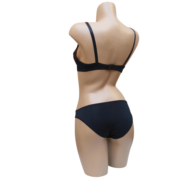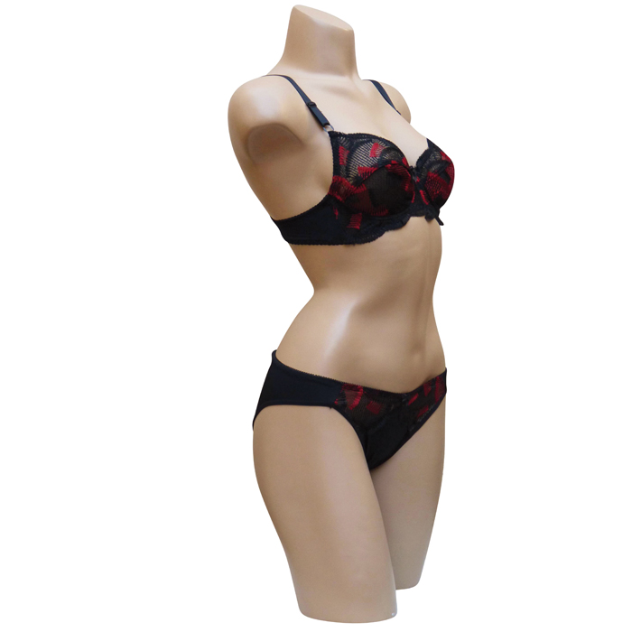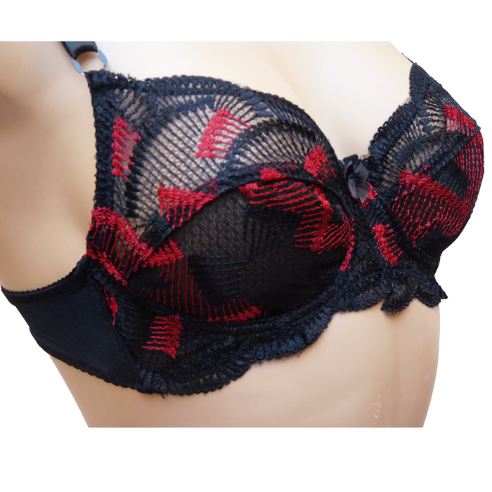 Ensemble grande taille, soutien gorge non rembourré avec armatures et slip. Soutien gorge bicolore avec motifs brodés sur maille filet stretch. Rappel de la dentelle sur le devant du slip.uni à l'arrière. 6 tailles. Existe aussi en Bonnet C, e1071c et bonnet E, e1071e