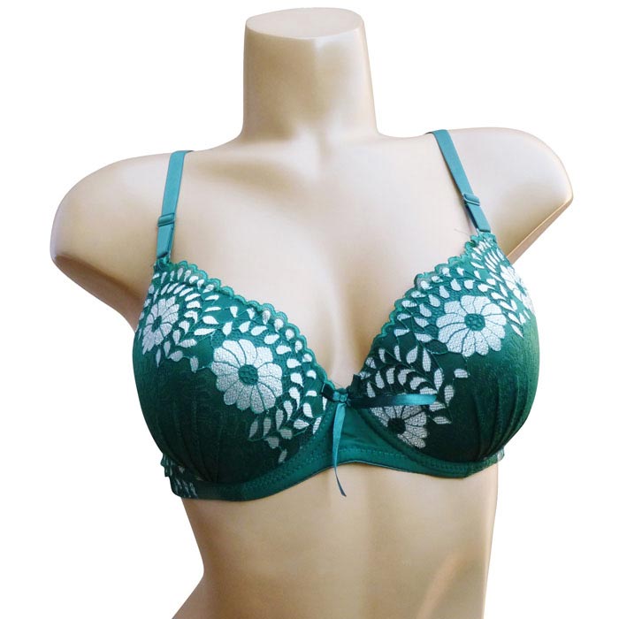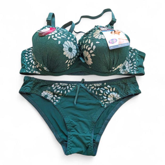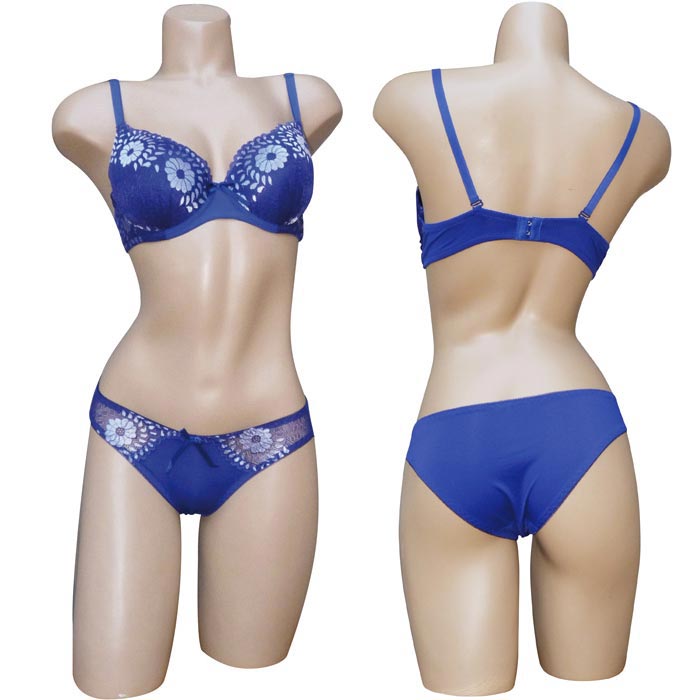 Ensemble soutien gorge avec slip. Soutien gorge bicolore avec armatures. Broderie "fleurs argentées" sur maille filet stretch. Fronces sous bonnet. Brides réglables et amovibles. Slip, rappel broderie sur les côtés, uni à l'arrière. Nœud satiné sur le devant. 6 tailles.