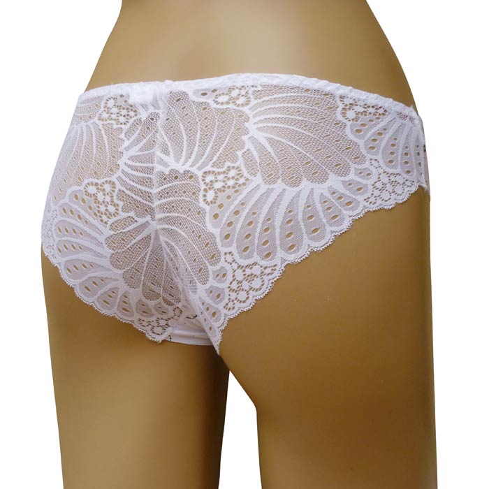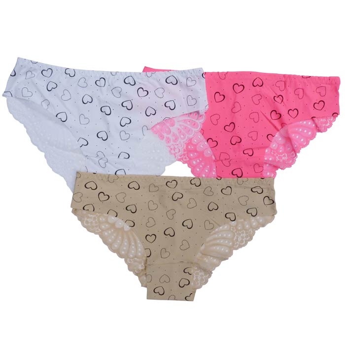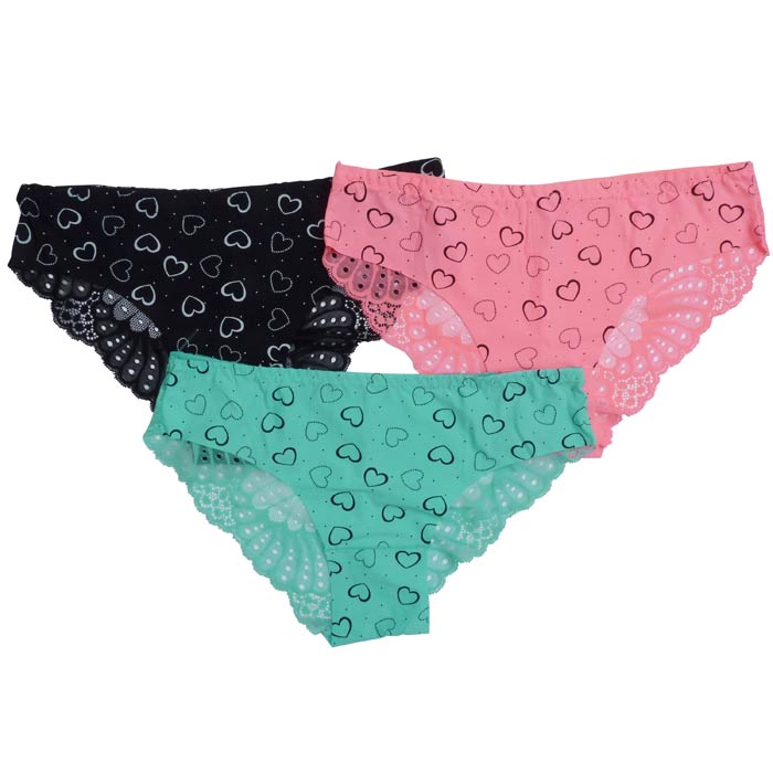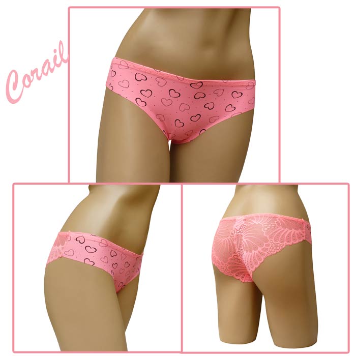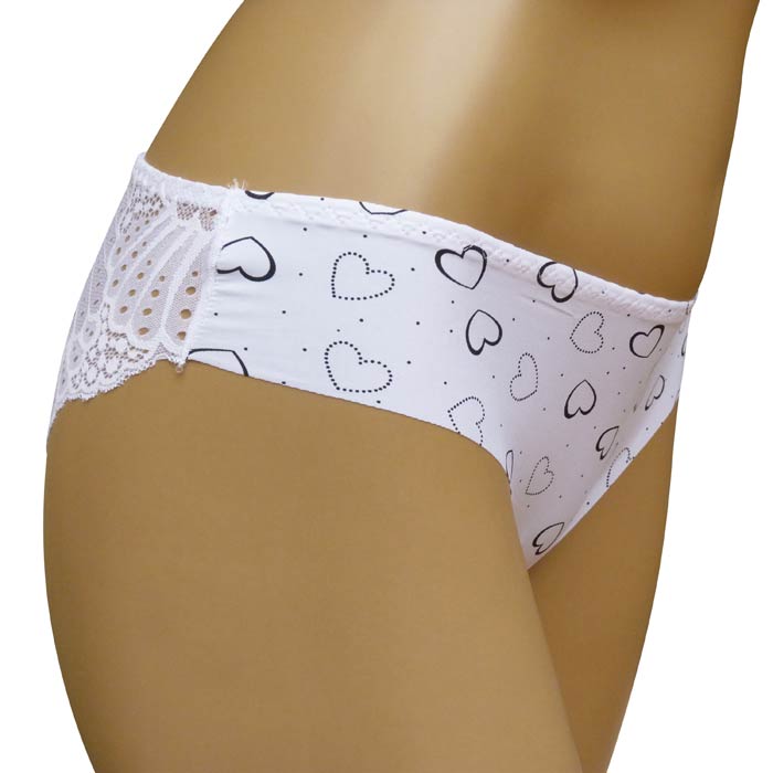 Slip femme en microfibre lycra, motif "cœurs" sur le devant. Agréable et doux à porter. Dentelle sur le derrière. 2 tailles : S-M et L-XL.