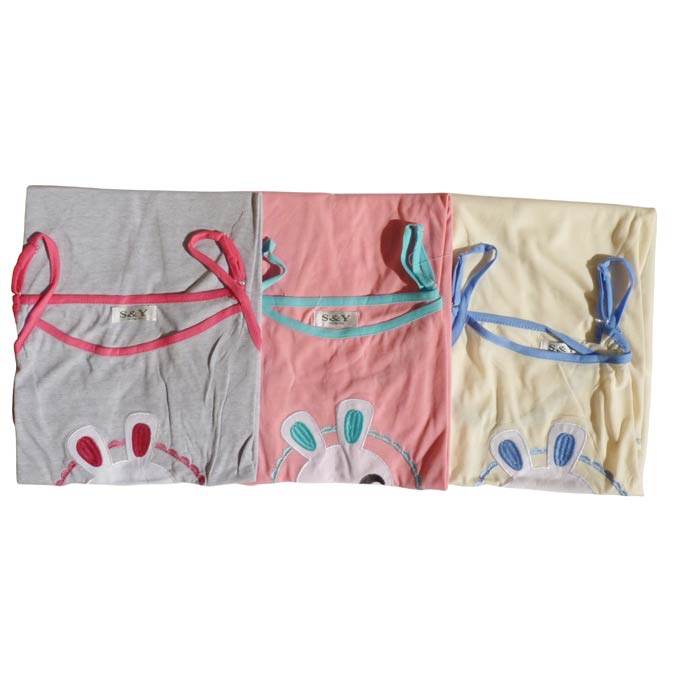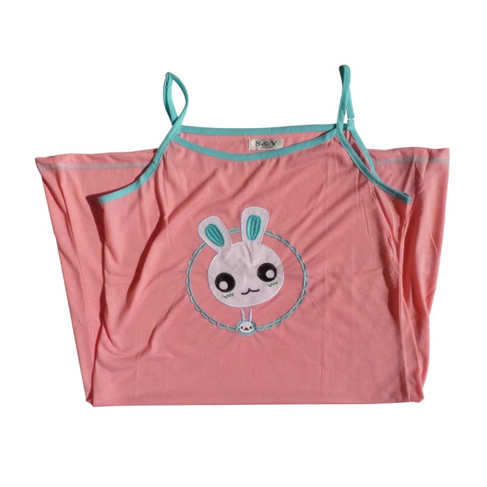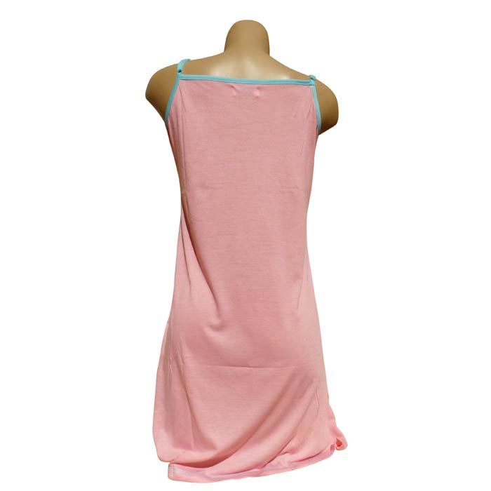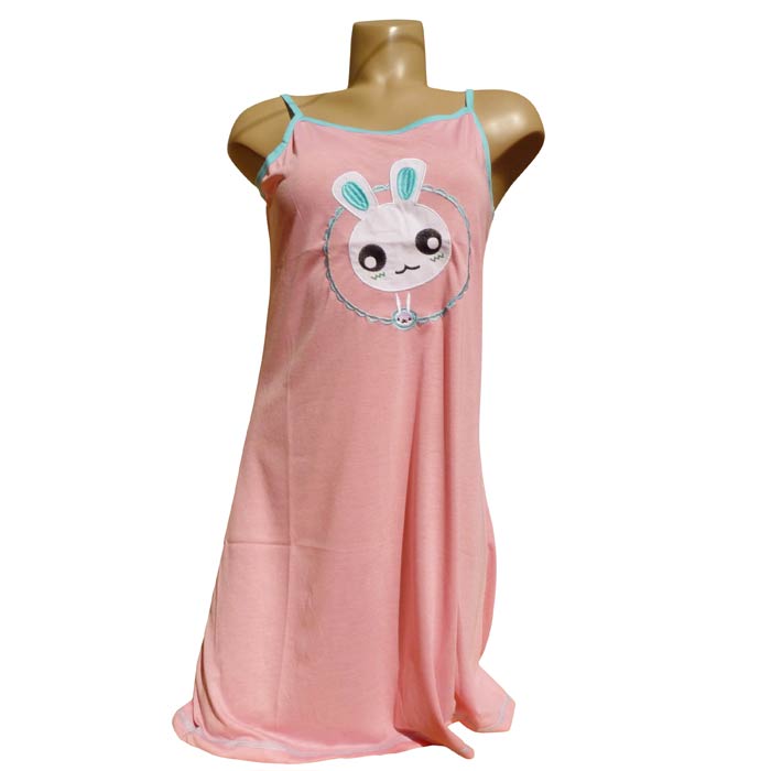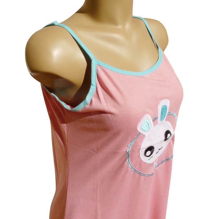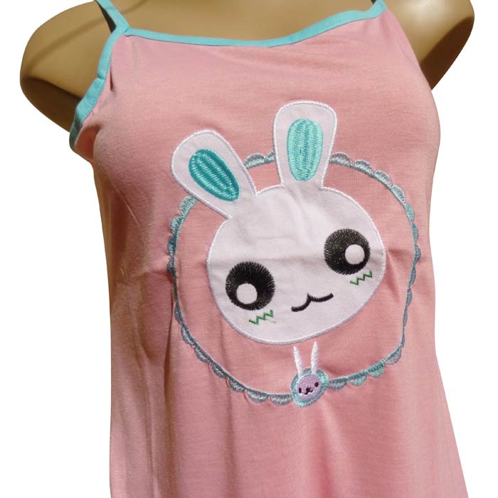 Robe de nuit sans manches, coton majoritaire. Longueur genou. Tissu fluide et léger. Broderies "lapins avec grandes oreilles" sur le devant- 2 fines brides réglables. Liseré contrasté sur le pourtour. Liseré de couture sur le bas de la robe. 5 tailles .