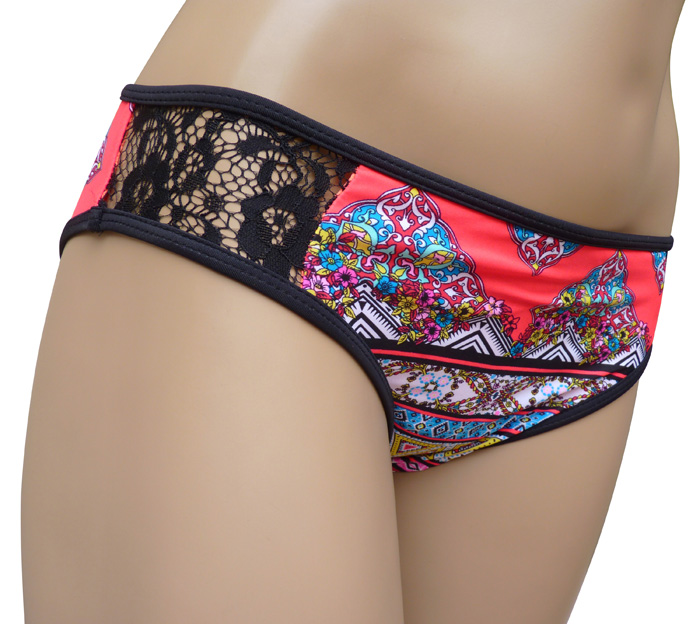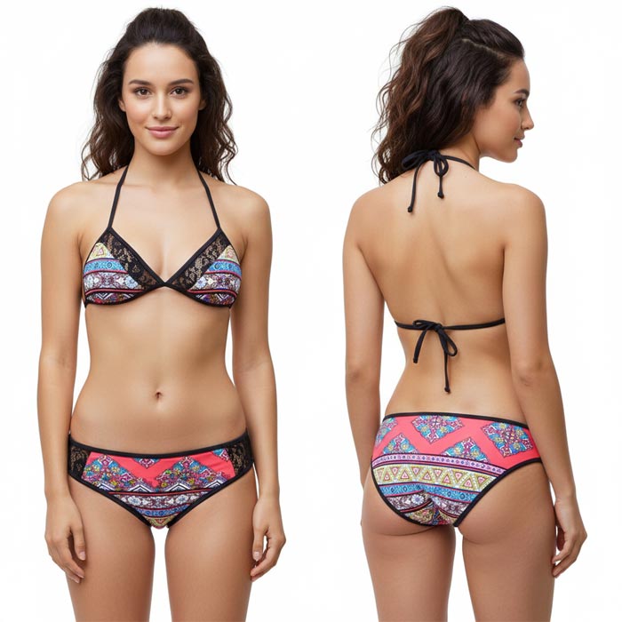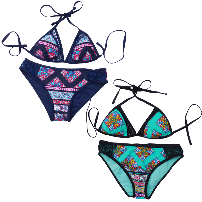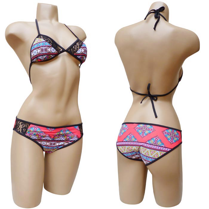 Maillot de bain 2 pièces femme, entièrement doublé. soutien gorge forme triangle avec mousses intégrées et amovibles. S'attache dans le dos et derrière le cou. Imprimé "aztèque" avec bande de dentelle sur la partie supérieure du bonnet. Bas du maillot avec rappel motif "aztèque devant et derrière, bande dentelle sur les côtés. 4 tailles et 4 couleurs.