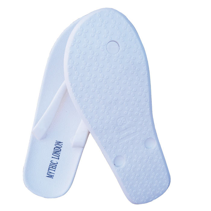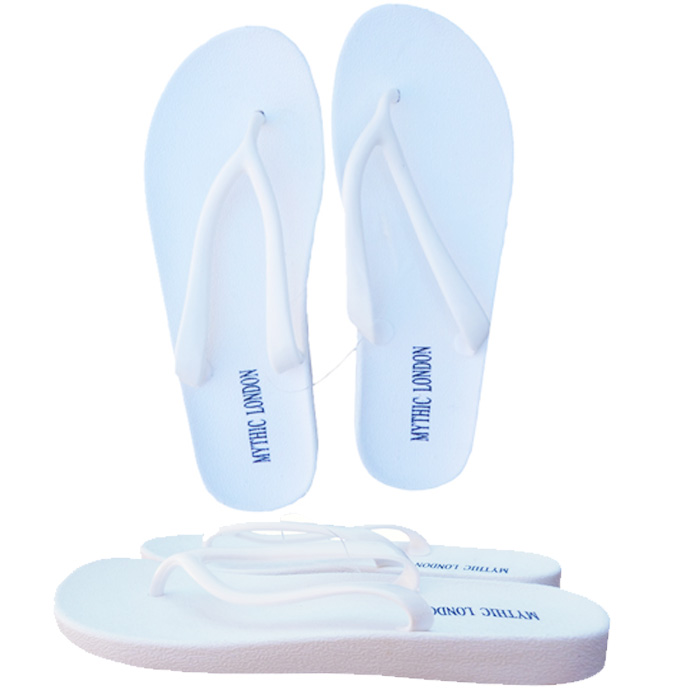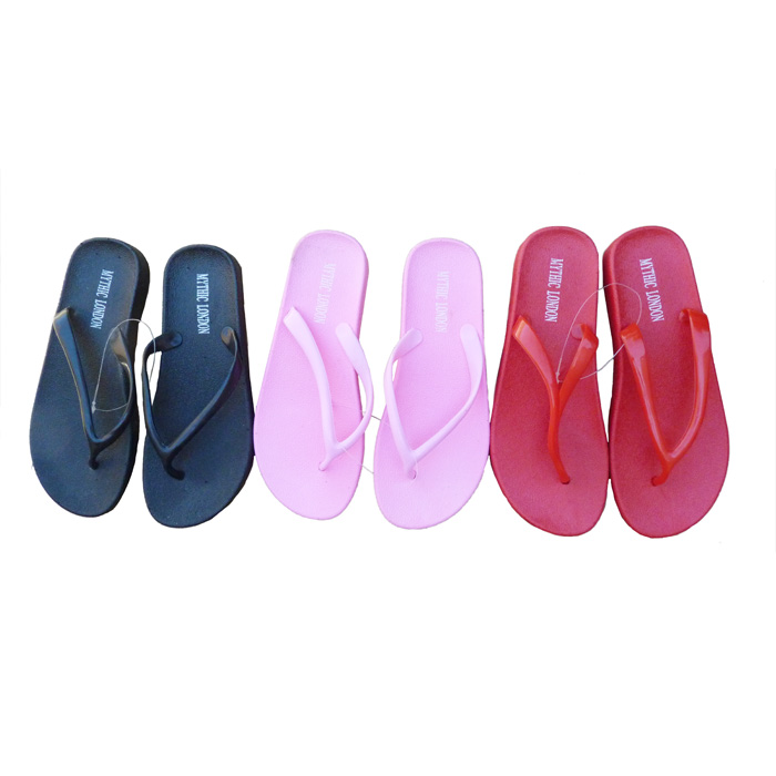 Tong femme uni. Bride synthétique, patte d'entre doigt. Inscription "Mythic London" sur la tongue. 6 Tailles de 36 a 41. Hauteur semelle environ 2,3 cm. 5 coloris différents. Majorité de couleur noir.