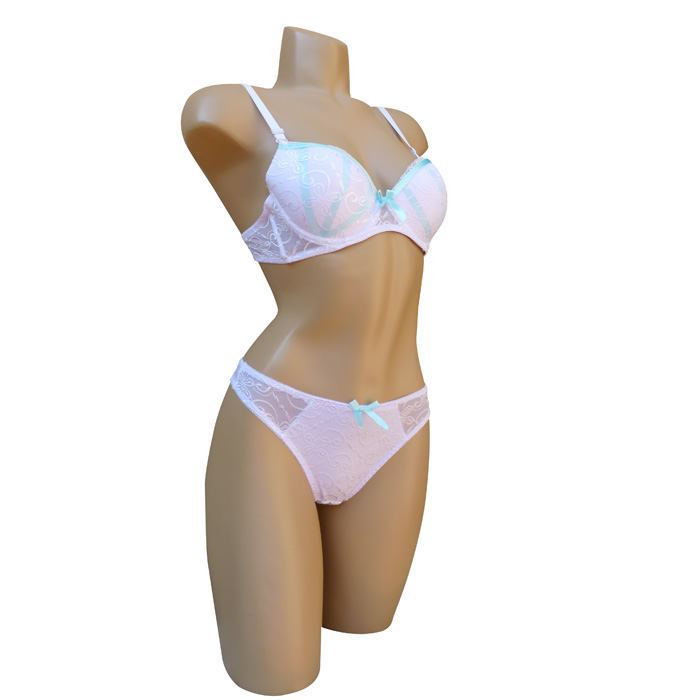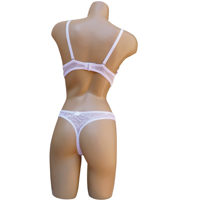 Ensemble soutien gorge avec tanga. Soutien gorge bicolore avec armatures. Broderie "fleurs satinée" sur maille filet stretch. Triples rubans satinés partant du bas du bonnet vers la partie supérieure terminé par un ruban sur le haut du bonnet . Nœud satin contrasté entre bonnet. Bretelles réglables et amovibles. Agrafes dos 3 positions. Tanga, rappel de la broderie sur le devant et sur l'arrière. 6 tailles. Attention : Taille européenne, indiqué Bonnet B sur étiquette correspond à un bonnet C.