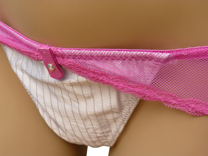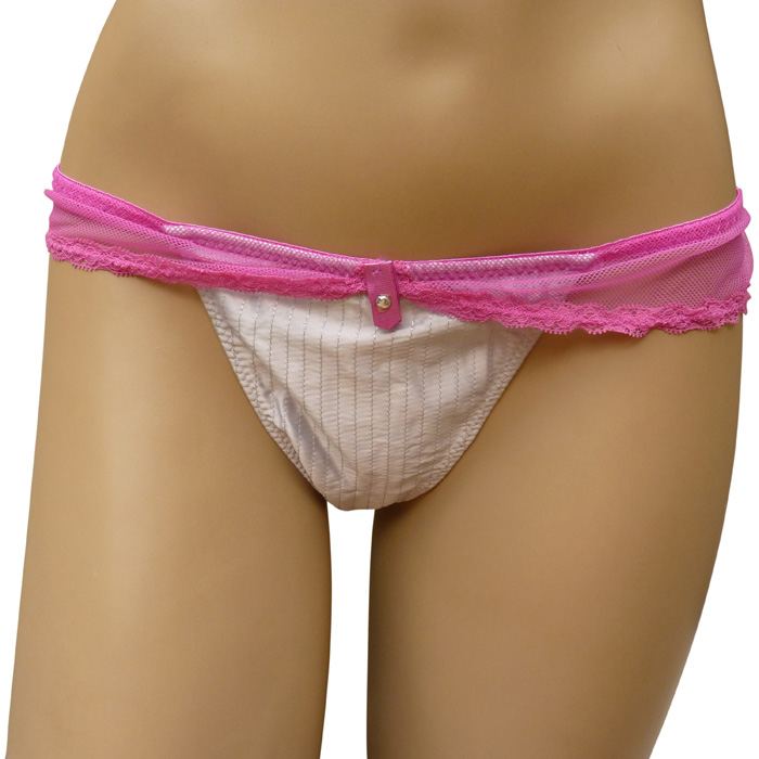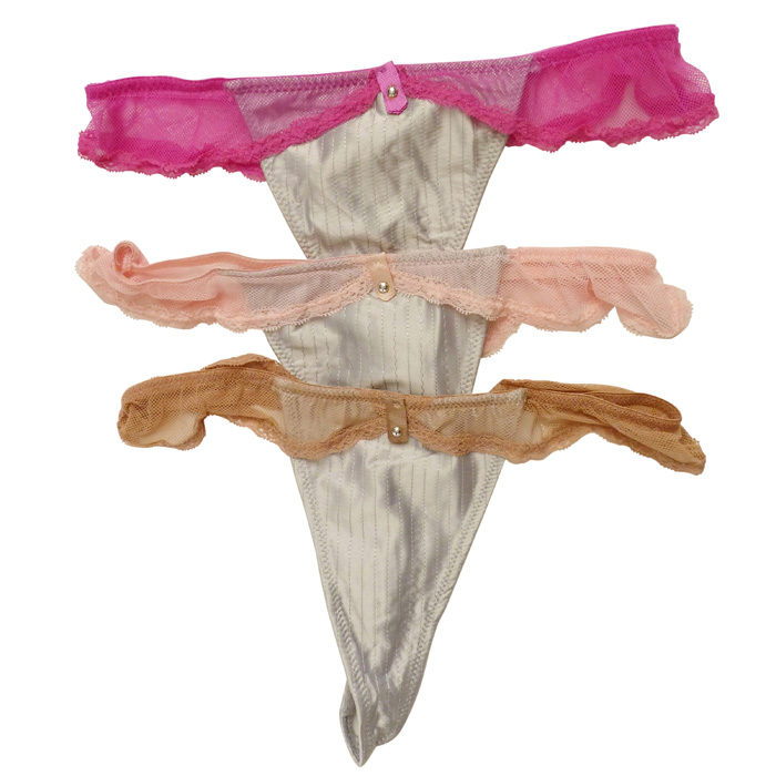 String ficelle, tissu effet satiné. Bande de dentelle sur le pourtour de la taille. Extensible. 2 tailles unique : S/M et L/XL.