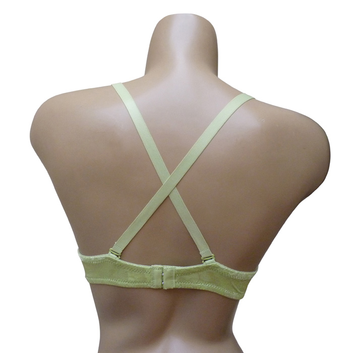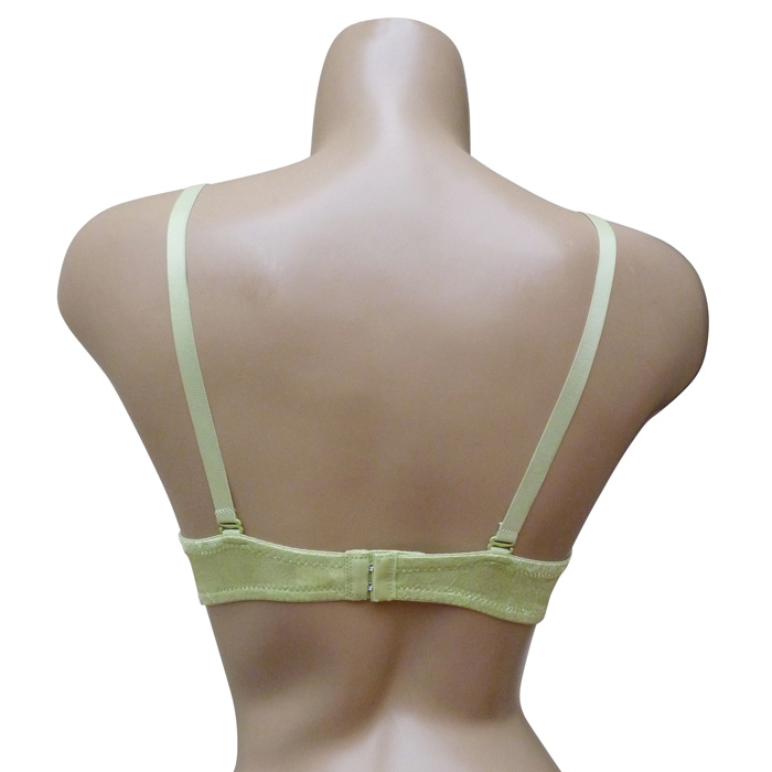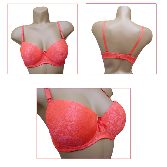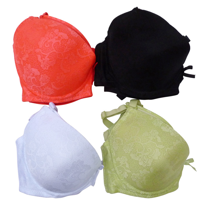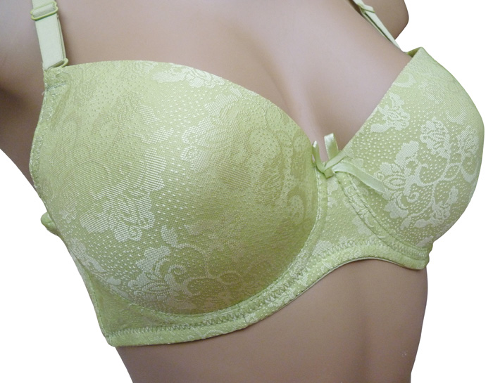 Soutien gorge avec coques et armatures. Tissu satiné avec motif discret "fleurs" ton sur ton. Nœud satin entre bonnet. Bonnet B. Bretelles réglables amovibles et multi-position. 6 tailles.