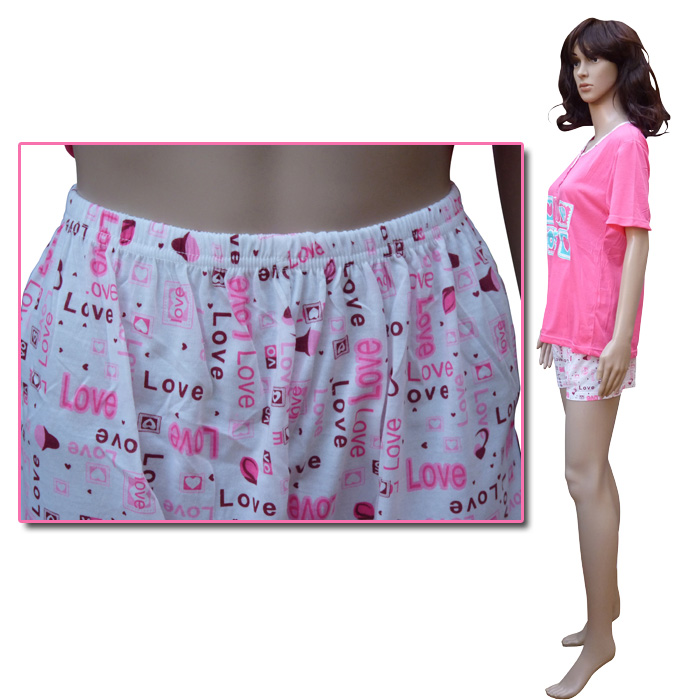 Pyjashort femme en coton majoritaire. Tunique avec short. Tunique manches courtes, col rond avec bouton sur le devant. Inscription "Love" et cœurs sur fond uni . Short avec rappel inscription "love" et cœurs sur fond blanc, élastiqué à la taille. 5 tailles.