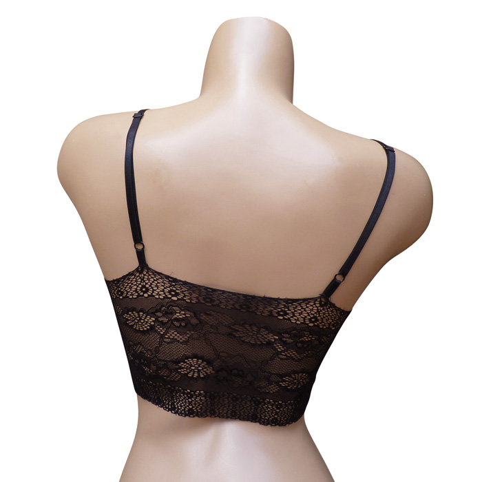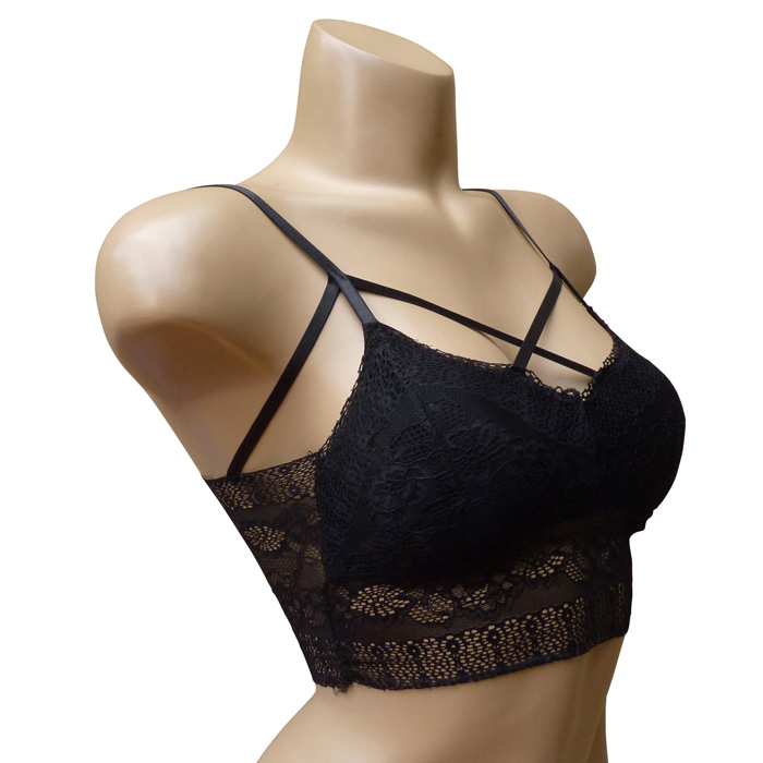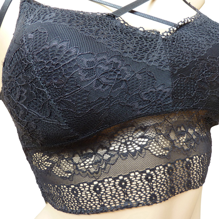 Soutien gorge en dentelle sexy, forme brassière. Soutien gorge sans armatures avec coussinets amovibles. Bande de dentelle "fleurs" sur maille résille stretch sous poitrine et dans le dos. Bretelles croisée sur le devant, brides réglables et non amovibles. 2 tailles : S/M et L/XL. Mannequin porte taille S/M.