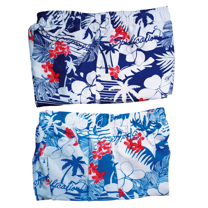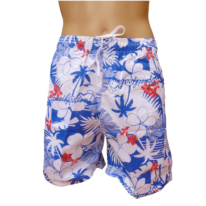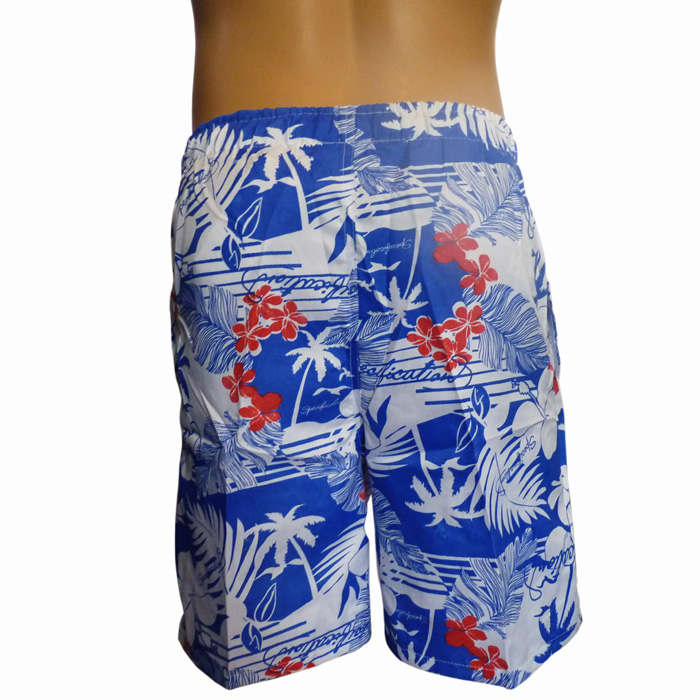 Bermuda de surf homme doublé d'un filet intérieur - ceinture taille élastiquée avec lacet de resserrage. Poches sur les côtés. Imprimé "fleurs" et "feuilles" des îles - 4 couleurs - 5 tailles : M - L - XL - XXL - XXXL