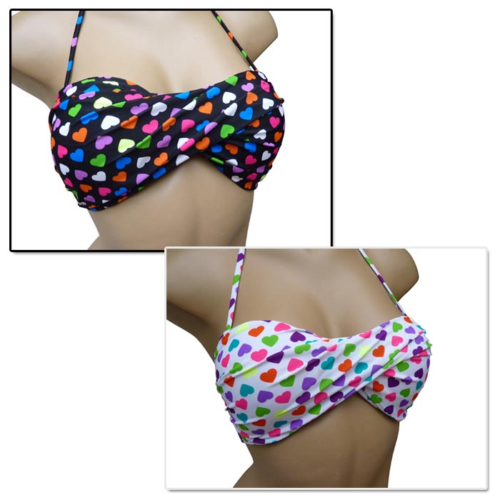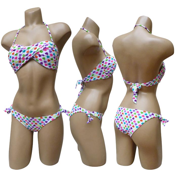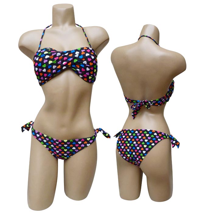 Maillot de bain femme 2 pièces. Soutien gorge forme bandeau, effet twisté sur le soutien gorge. Fines brides amovibles s'attachent au cou et se noue au dos. Slip entièrement doublé, se noue sur les côtés. Motif "fleurs cœurs multicolores" sur l'ensemble du maillot. 4 tailles.