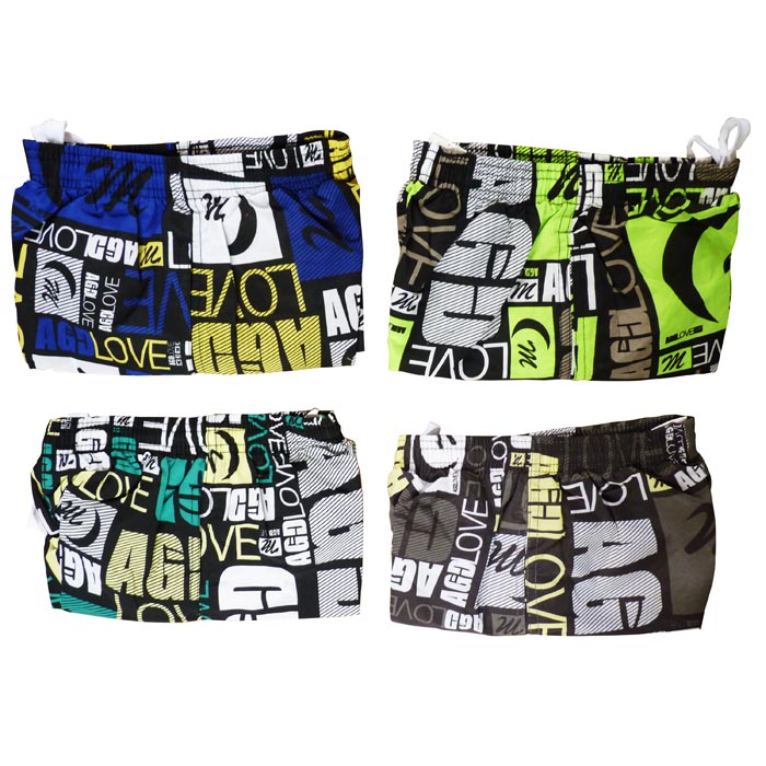 Bermuda surf garçon. Doublé d'un filet intérieur. Taille élastiquée avec lacet de resserrage. 2 poches sur les côtés. Imprimé "graphique" + différentes inscription sur l'ensemble du bermuda. 6 couleurs et 6 tailles : de 4 à 14 ans. Répartition Tailles restantes : 4 ans x 4 pièces - 6 ans x 2 pièces - 8 ans x 3 pièces -10 ans x 2 pièces - 12 ans x 3 pièces - 14 ans x 3 pièces.