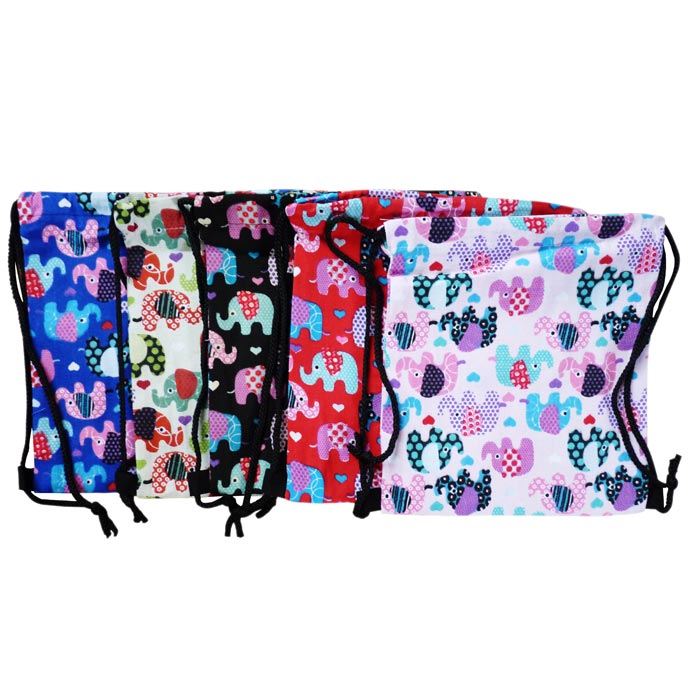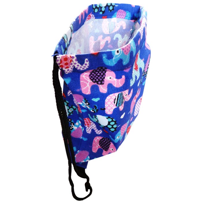 Petit sac à dos pour enfant. Bandoulières cordes noires nœud coulissant. Motif éléphant multicolores" sur fond uni. Largeur=25cm, longueur=28,5cm.
