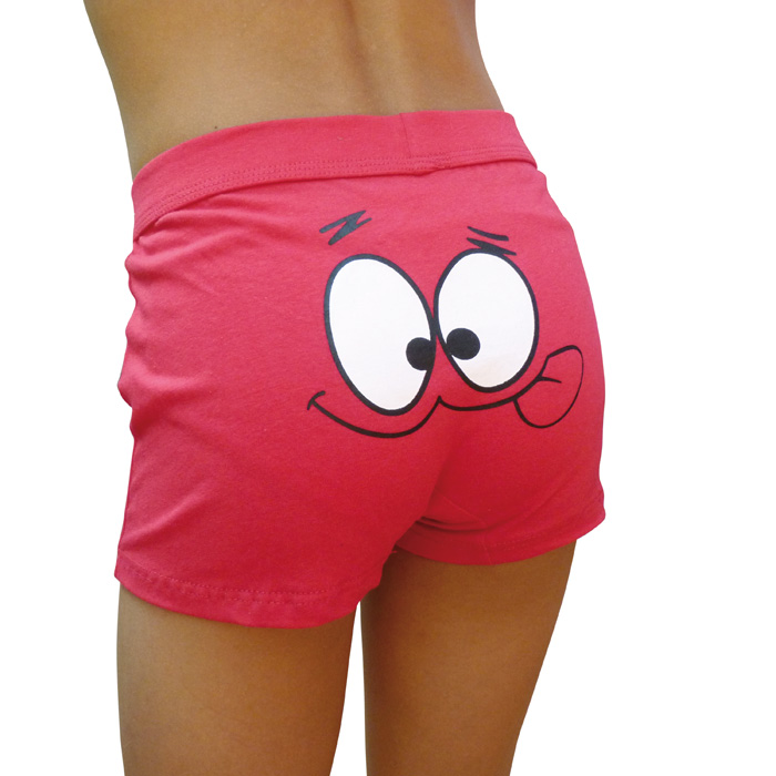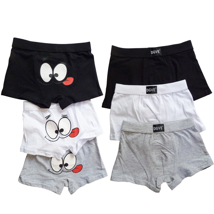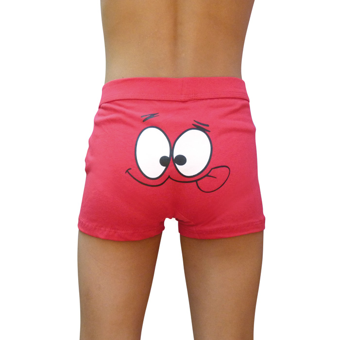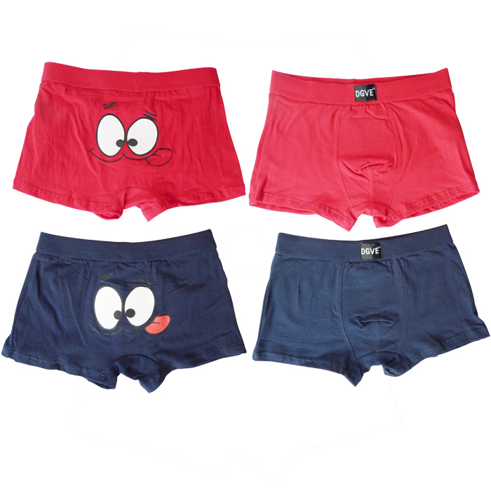 Boxer garçon coton majoritaire, partie avant doublée. Boxer uni à l'avant et motif "yeux et langue" sur le derrière. ceinture taille gomme avec inscription "DGVE". 5 couleurs. 4 tailles : 2/4ans, 4/6 ans, 6/8ans, 10/12 ans.