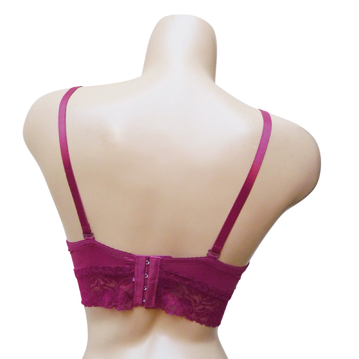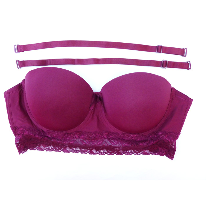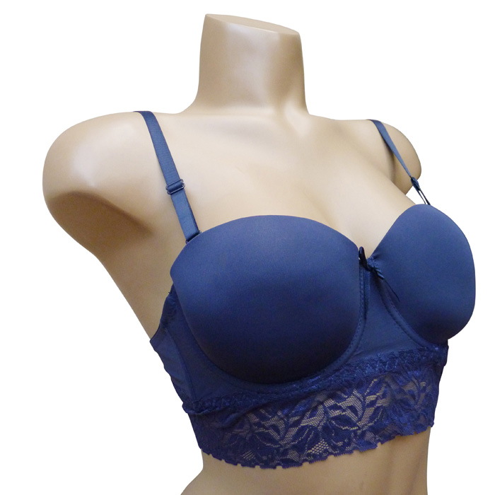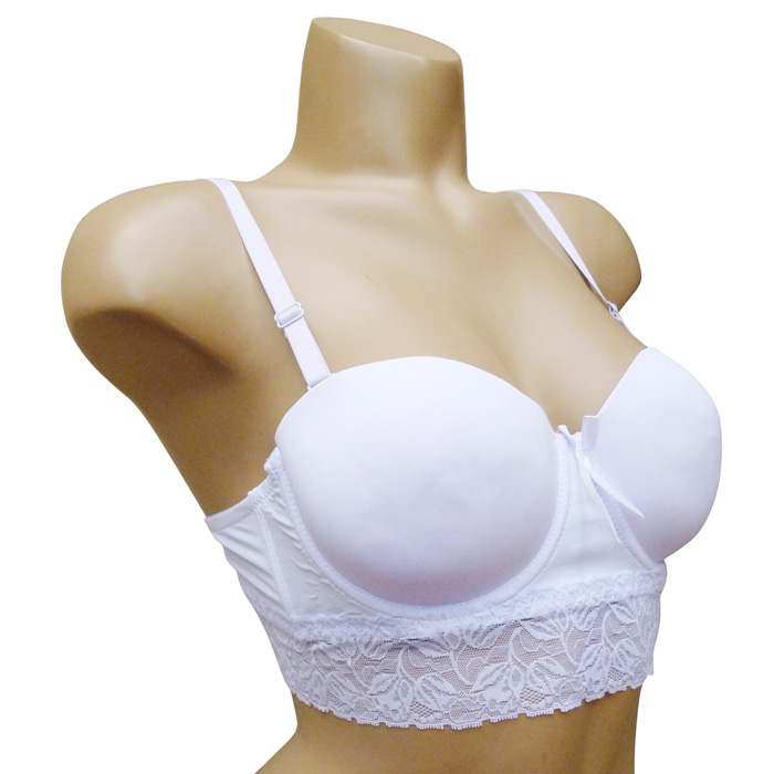 Soutien gorge bustier, coques souples, forme bandeau. Soutien gorge, bonnet B, avec baleines rehaussé par une large bande de dentelle sur maille résille stretch sous poitrine et dans le dos. Bretelles réglables et amovibles. Ouverture dos, quatre agrafes triple positions. 6 tailles.