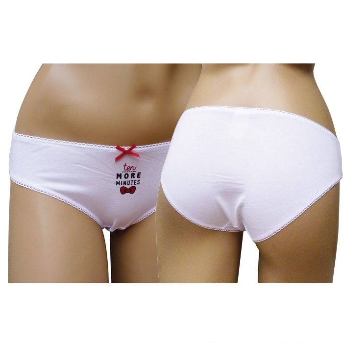 Culotte femme coton majoritaire. Slip uni avec motif dessin et inscription sur le devant. Élastique à la taille. 4 Tailles : S-M-L-XL