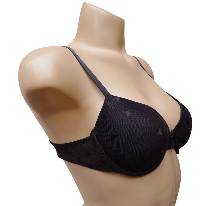 Soutien gorge très confortable, bon maintien bonnet B recouvert d'une fine dentelle avec des petits "cœurs" ton sur ton. Bretelles réglables et non amovibles. Fermeture dos, 2 agrafes. 6 tailles.