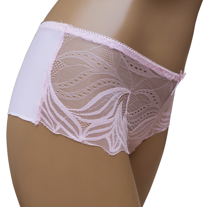 Boxer femme en microfibre lycra, doux au toucher, confortable et très agréable. Fleurs brodées sur maille résille stretch sur le devant, uni sur l'arrière. Découpe laser en forme de vagues sur les fesses. Élastiquée à la taille. 2 tailles .