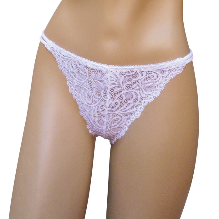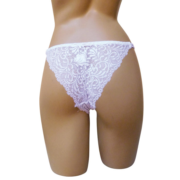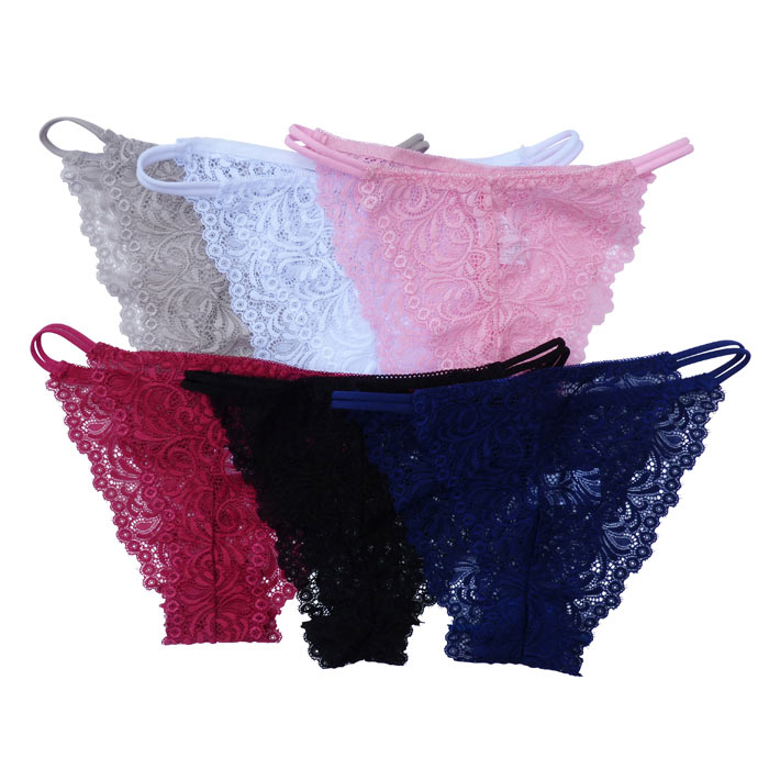 Culotte femme tout en dentelle devant et derrière. Double brides sur les côtés. Doublé sur le fond. 2 tailles : S/M et L/XL. Majorité de couleur noir et blanc.