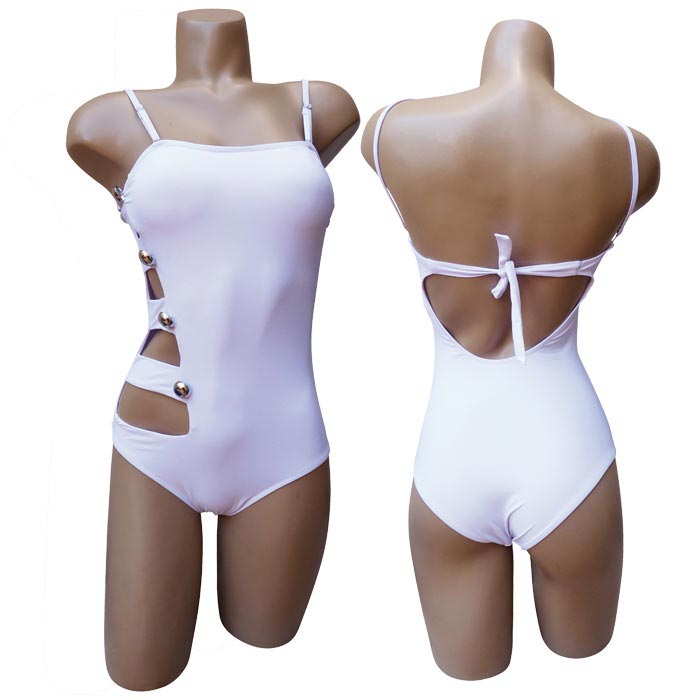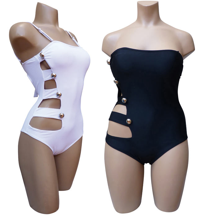 Maillot 1 pièce entièrement doublé à l'avant et à l'arrière. Soutien gorge forme bandeau avec coussinets mousses amovibles. Maillot de bain uni avec 4 zones ajourées ornées de boutons argentés. Bretelles réglables et amovibles. Échancrure dos, attache dans le dos. 4 tailles.