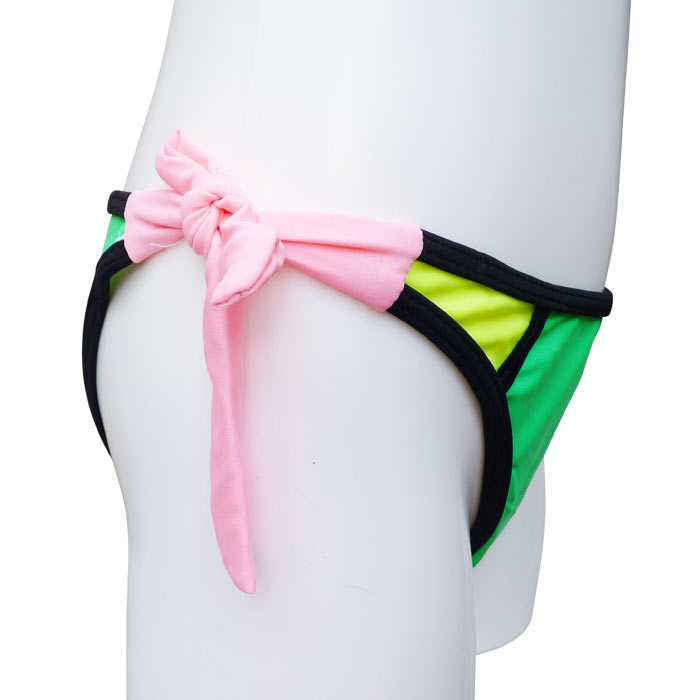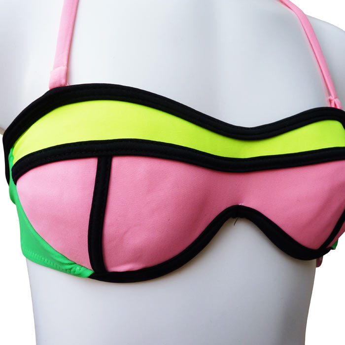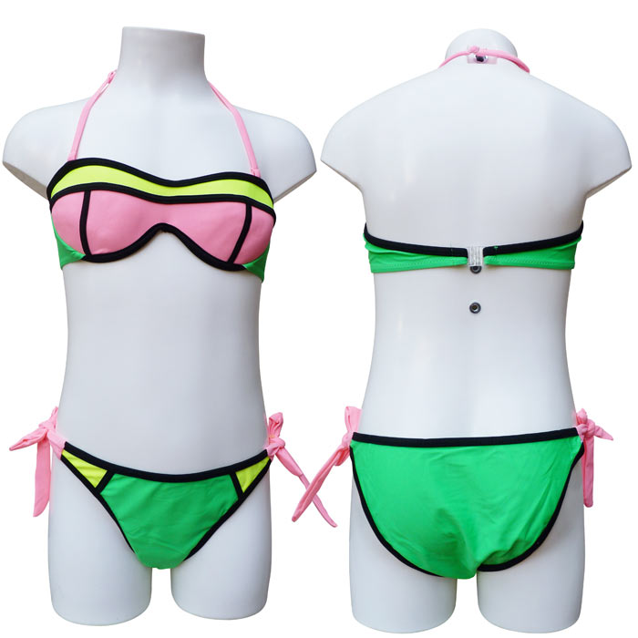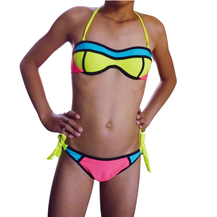 Maillot de bain fille, 2 pièces tricolore avec slip. Soutien gorge armatures, forme bandeau, coques souples, effet baleine latérale. Fermeture au dos par un clip - Brides autour du cou réglables et amovibles - Slip tricolore, entièrement doublé, attache sur les côtés . 6 tailles : indiqué sur étiquette de 6 ans à 16 ans.