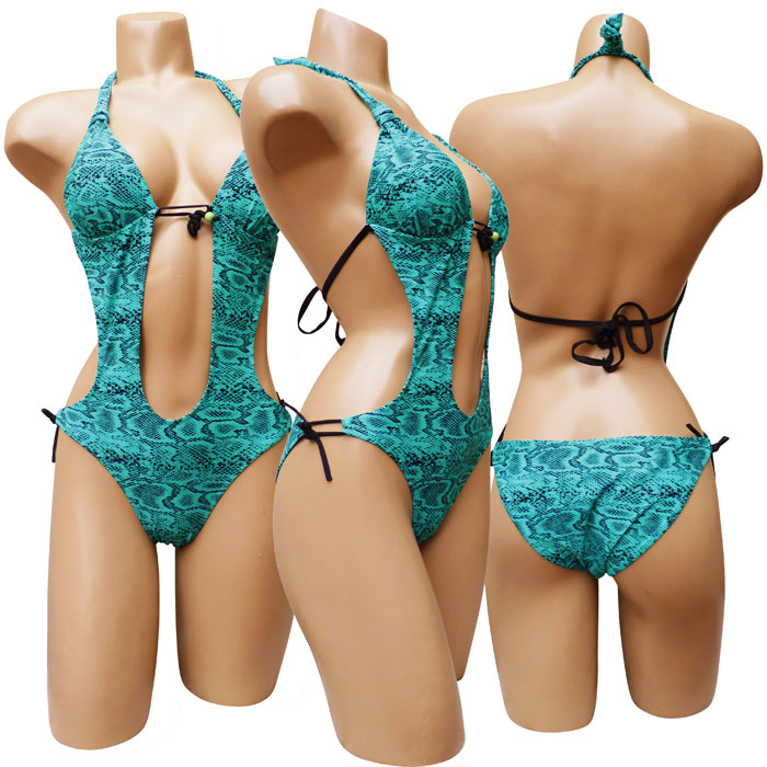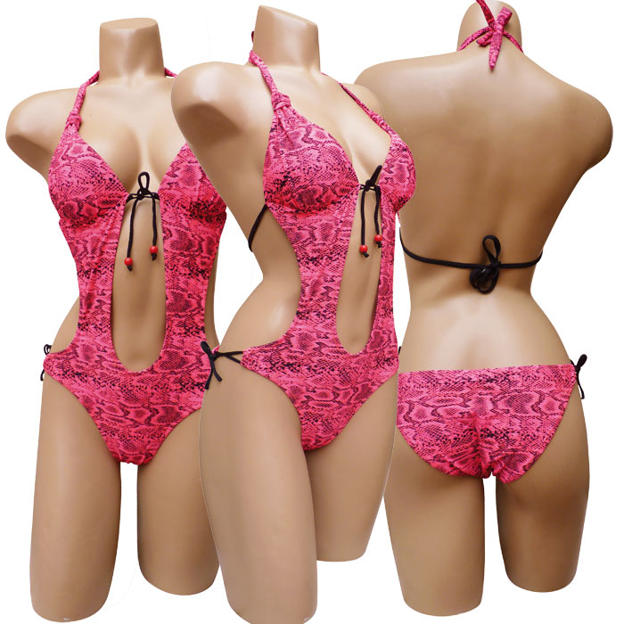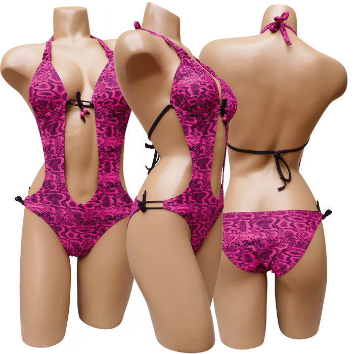 Trikini entièrement doublé . Soutien gorge forme triangle, coqué, rembourré sans armatures. Trikini bicolore sexy, imprimé peau de serpent. Se noue dans le dos et derrière le cou. Slip ajustable sur les côtés. 4 tailles.