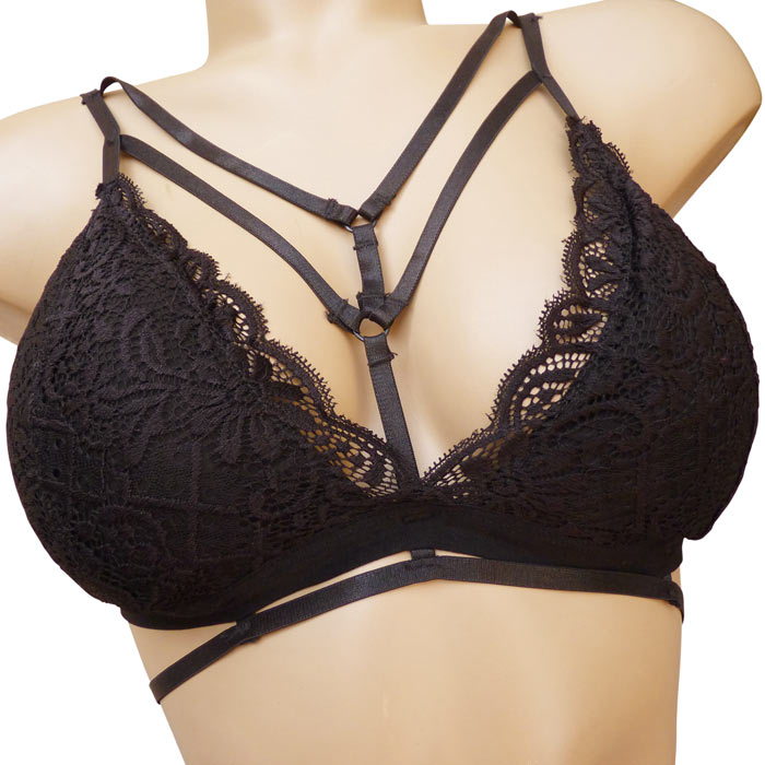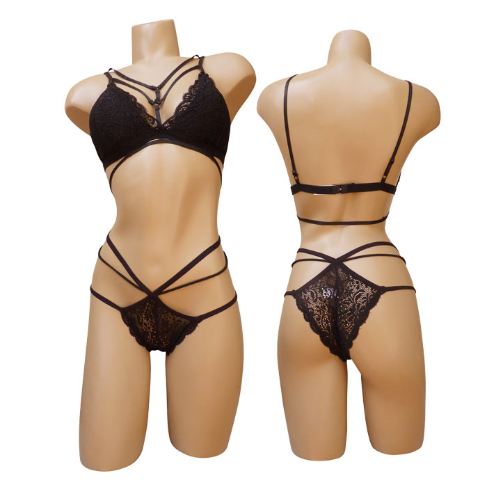 Ensemble soutien gorge en dentelle très sexy avec tanga. Soutien gorge forme triangle sans armatures, mousses intégrées amovibles. Multi brides sur le devant du soutien gorge. Fermeture dos 1 agrafe, 3 positions. Fines bretelles ajustables. Tanga avec rappel jeu de brides formant un ensemble très sexy. 2 tailles. S/M et L/XL. Vendu par lot de 6 pièces et seulement en noir.