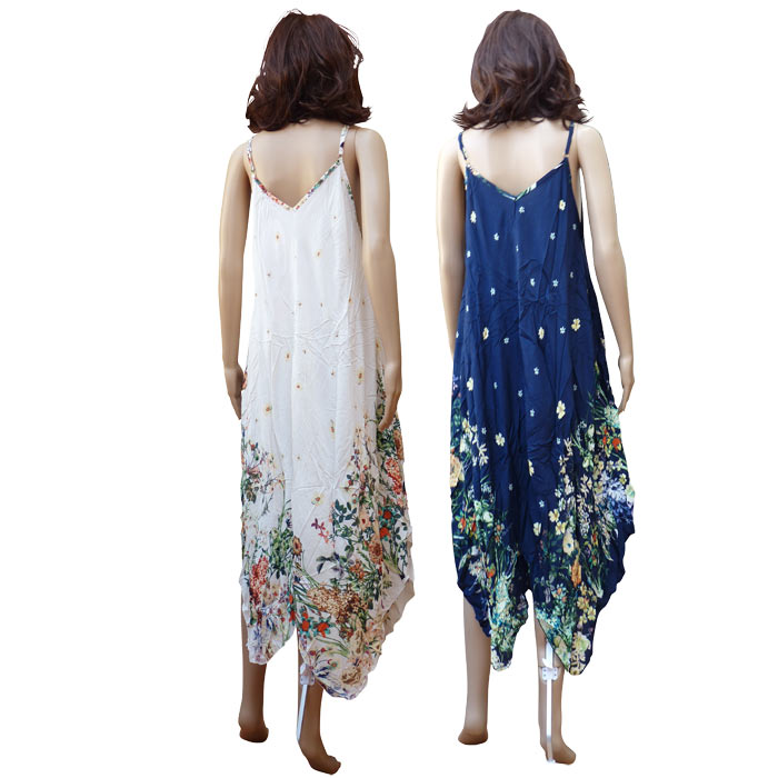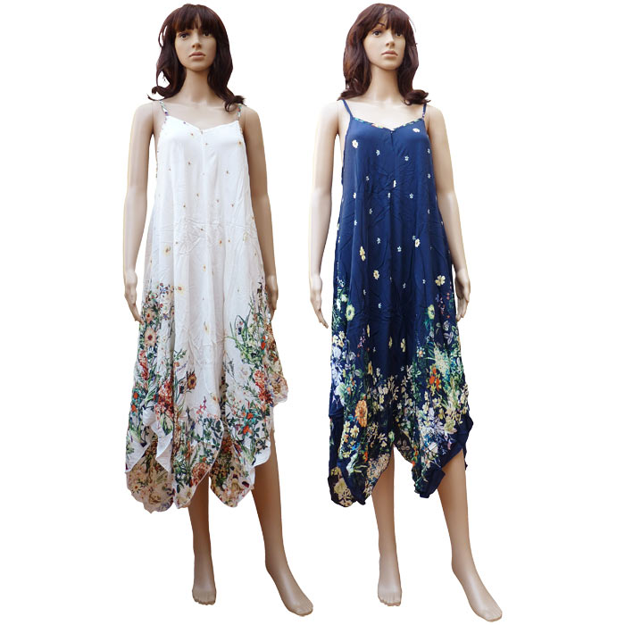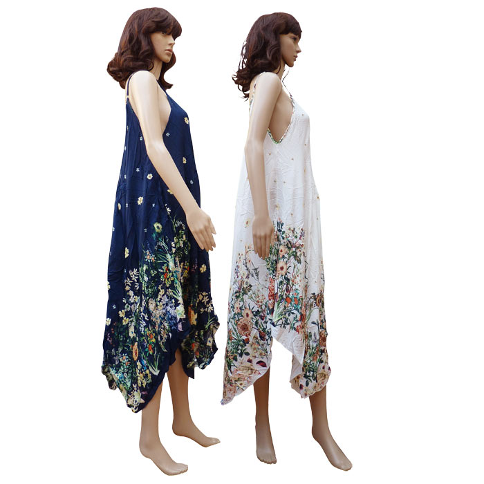 Robe sortie de plage, longue, fines bretelles réglables. Tissu très agréable, doux au toucher. Forme très évasée, bas asymétriques (Bas terminés par des pans en triangle) avec motifs "fleurs" déclinés dans 2 coloris différents avec une majorité de blanc. Taille unique.