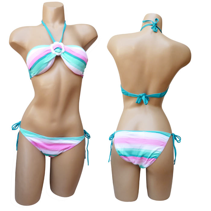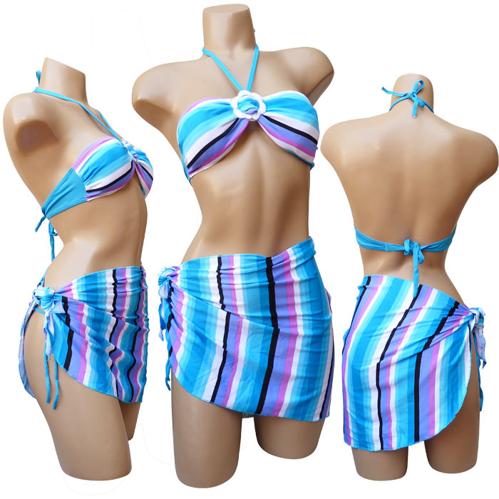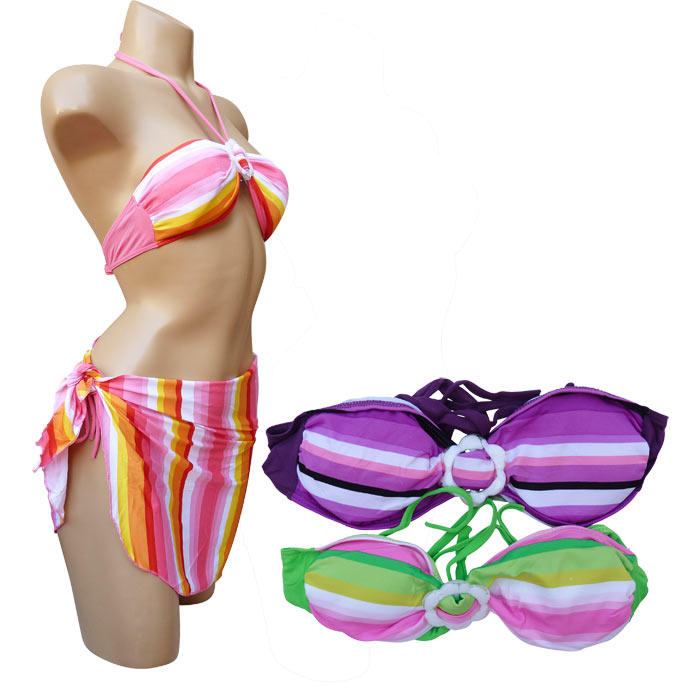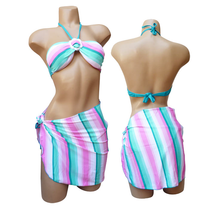 Maillot de bain 2 pièces avec jupette ou paréo. Bas doublé sur le devant. Soutien gorge forme bandeau sans armatures avec coussinets amovibles, s'attache dans le dos et dans le cou. Boucle en forme de fleurs entre les bonnets. Larges bandes de couleurs, type arc-en-ciel horizontales ou verticales. Slip, se noue sur les côtés. 3 tailles.