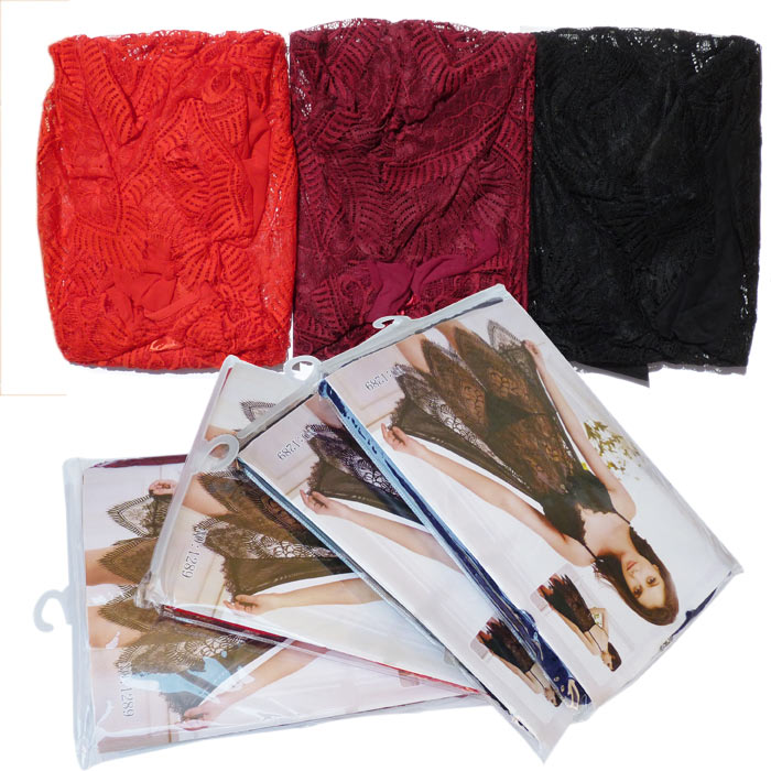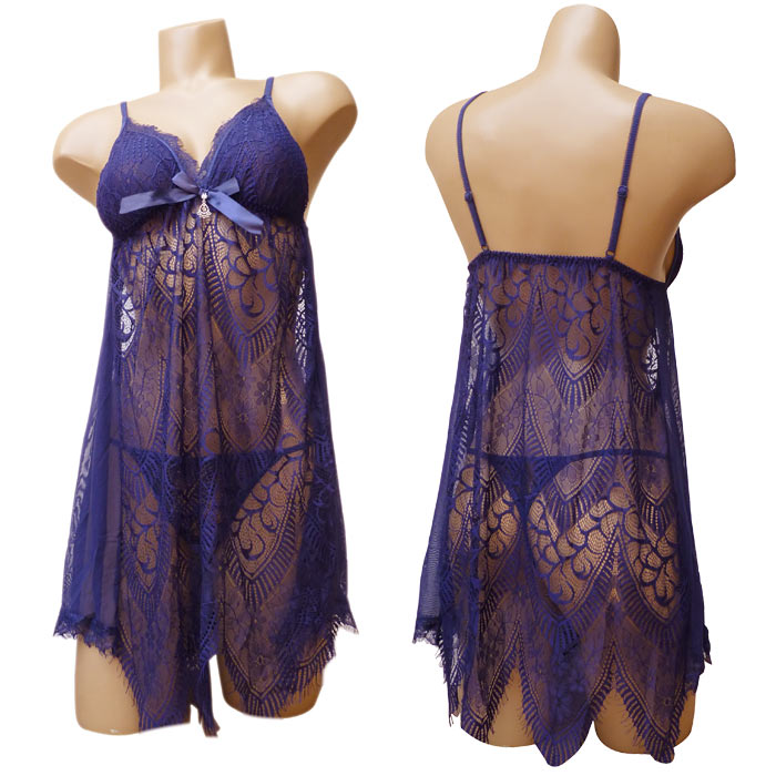 Nuisette sexy longueur mi cuisse, forme évasée, en dentelle stretch, broderie sur maille résille stretch avec tanga. Soutien gorge forme triangle non rembourré sans armatures orné d'un nœud satiné et petit bijoux argenté entre-bonnet. Tanga, rappel broderie. Taille unique. Nuisette déclinée dans 4 coloris avec une majorité de noir. Livré dans des pochettes transparentes avec petit cintre comme sur la photo.