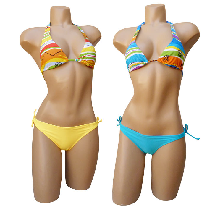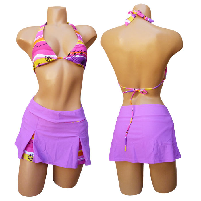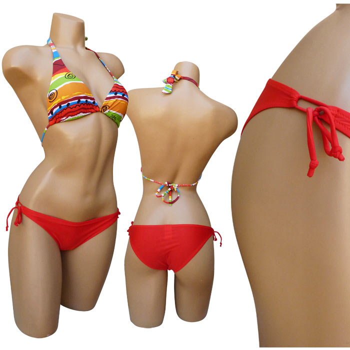 Maillot de bain 2 pièces avec jupette ou paréo. Soutien gorge forme triangle, sans armatures. Se noue autour du cou et s'attache dans le dos. Imprimé graphique multicolore sur le soutien gorge.