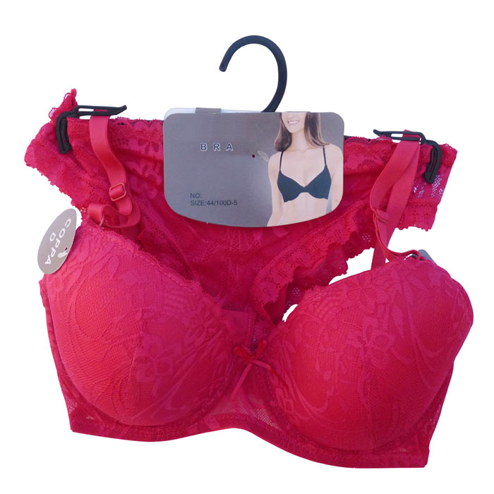 Ensemble soutien gorge avec slip. Soutien gorge Bonnet D coques souples, avec armatures. Dentelle sur maille résille stretch. Nœud satiné entre-bonnet. Bretelles réglables et amovibles. Fermeture 3 agrafes dos, 3 positions. Slip avec rappel dentelle sur le devant,uni à l'arrière. Livré sur cintre. 6 tailles: 105D au 125D