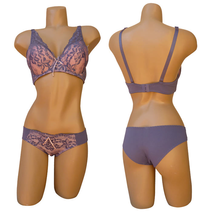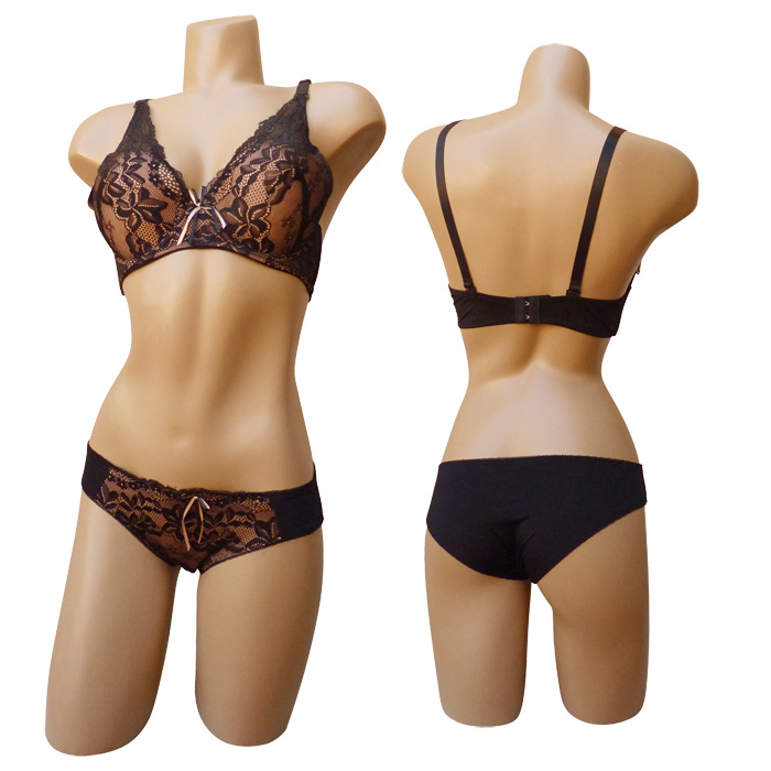 Ensemble soutien gorge avec slip. Soutien-gorge coques souples avec armatures, bonnet D. Dentelle sur l'ensemble des bonnets jusqu'à recouvrir une partie des bretelles. Brides réglables et non amovibles. Nœud satiné entre-bonnet. Fermeture doubles agrafes dans le dos et 3 positions d'accroche. Culotte, rappel dentelle sur le devant, uni à l'arrière. 6 tailles : 90D au 115D.