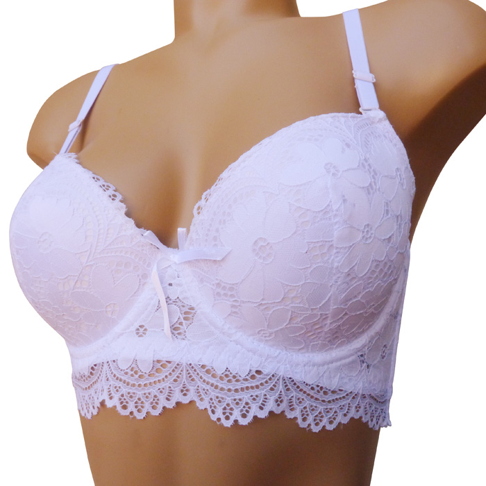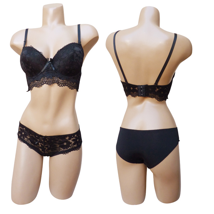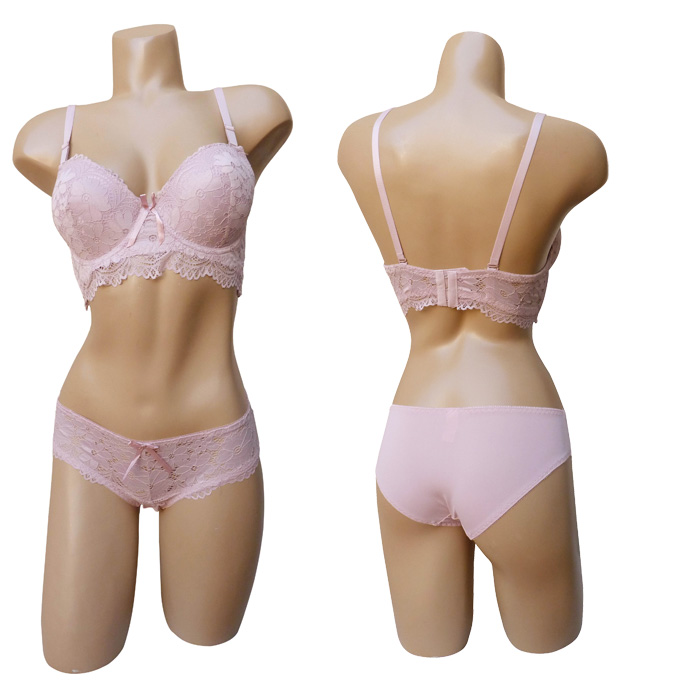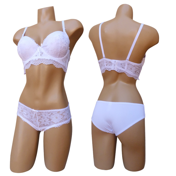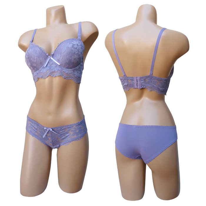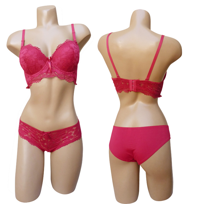 Ensemble soutien gorge avec slip. Soutien-gorge rembourré, coques souples avec armatures, bonnet C. Dentelle satiné stretch sur le bonnet. Bande dentelle sous poitrine. Brides réglables et amovibles. Nœud satiné entre-bonnet. Fermeture triple agrafes dans le dos. Culotte dentelle sur le devant, uni à l'arrière. 6 tailles : 85C au 110C. Livré sur cintre.