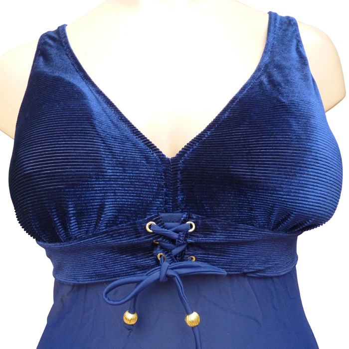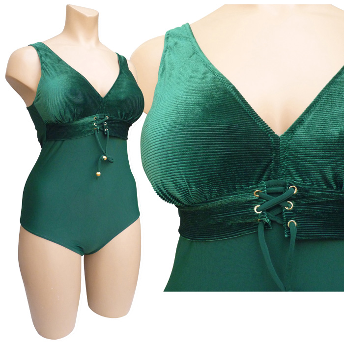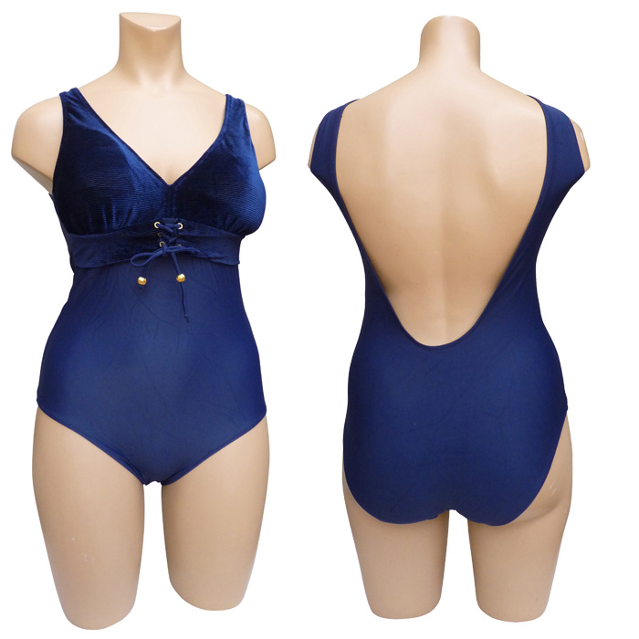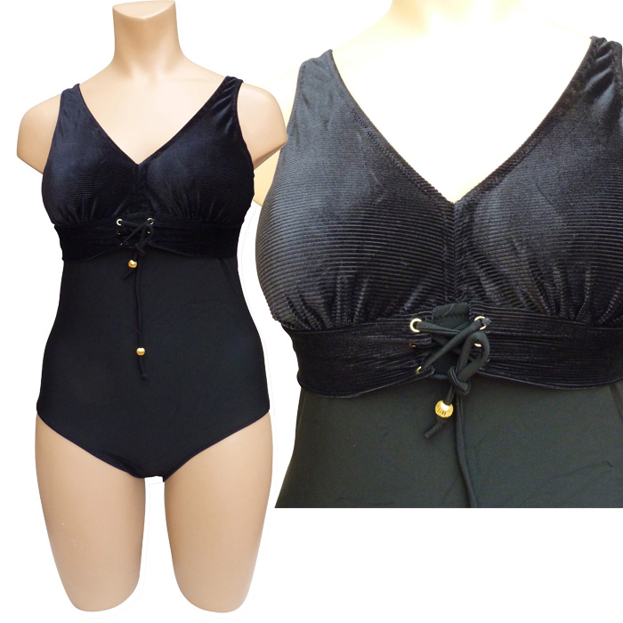 Maillot de bain uni 1 pièce entièrement doublé, grande taille. Soutien gorge forme triangle avec coussinets mousses amovibles. Lacet de resserrage de sous poitrine. Échancrure dos. Tissu velouré au niveau des bonnets et du lacet de resserrage. 4 couleurs et 5 tailles. Taille italienne indiquée sur étiquette.