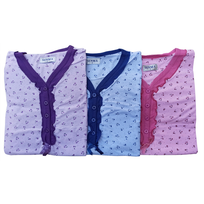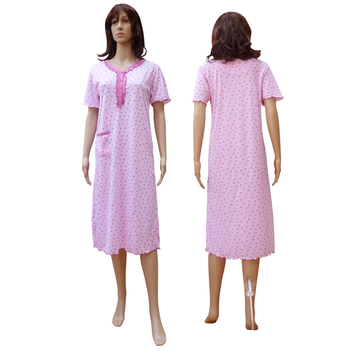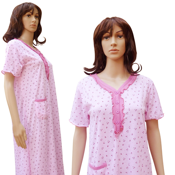 Chemise de nuit longue jusqu'au genou. Coton majoritaire, manches courtes. Col en "V" avec boutons, imprimé petites "fleurs" sur l'ensemble. Petite poche sur le côté. 5 tailles - Indiqué sur étiquette M-L-XL-2XL-3XL.