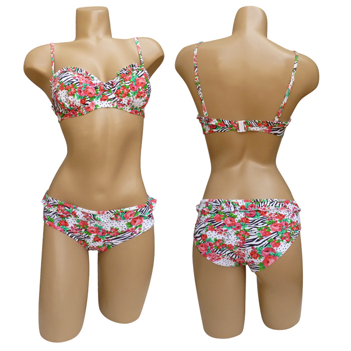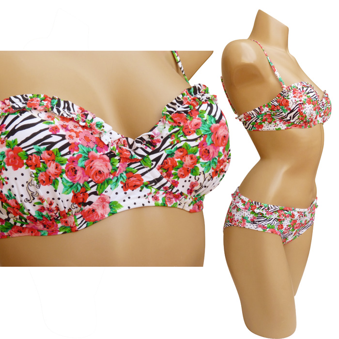 Maillot de bain 2 pièces avec slip. Soutien gorge forme bandeau avec armatures. Soutien gorge bretelles réglables et amovibles, se clipse au dos. Imprimé "fleurs rouges" sur l'ensemble du maillot. Bas du maillot entièrement doublé avec rappel imprimé, mini volant sur le pourtour de la taille. 5 tailles. Taille européenne indiquée sur étiquette.