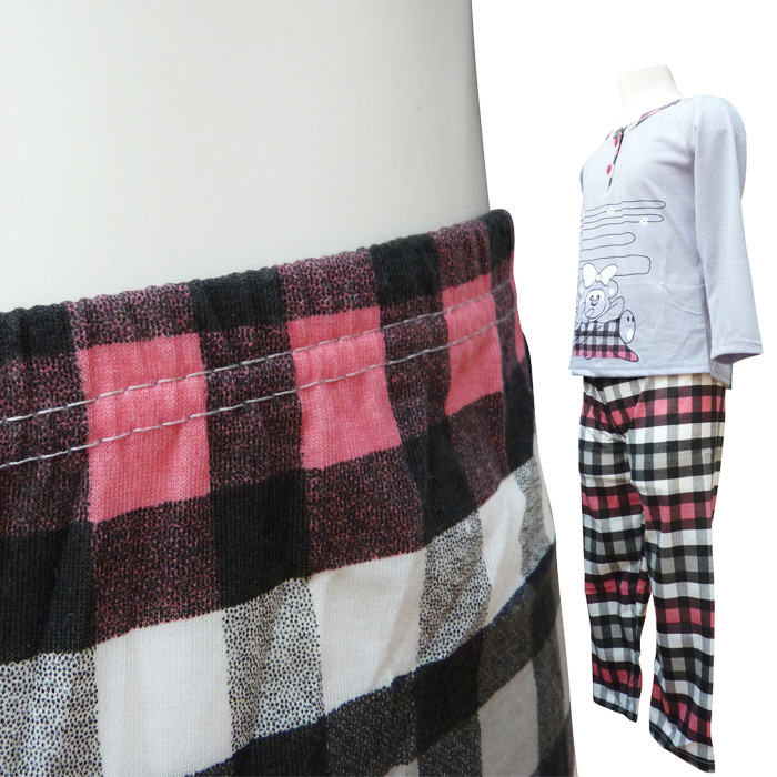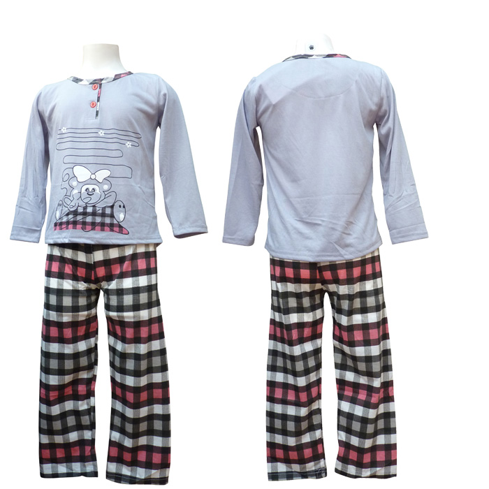 Pyjama enfant manche longue, pour fille de 4 à 12 ans, coton majoritaire. Col rond boutonné liseré "petits carreaux". Dessin sur le devant de la tunique, uni sur l'arrière. Pantalon à carreaux élastiqué à la taille. 5 tailles.