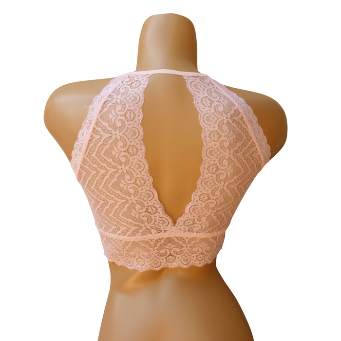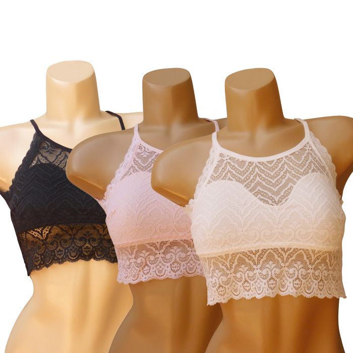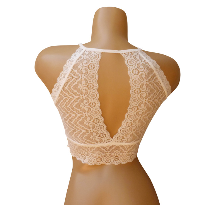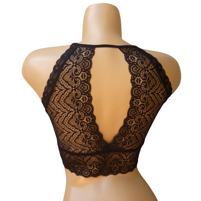 Soutien-gorge bralette en dentelle sexy, forme bandeau. Soutien gorge sans armatures. Bande de dentelle sur maille résille stretch sous poitrine et dans le dos. Dos nageur avec ouverture dans le dos. S'enfile comme un tee-shirt. 3 coloris dans le paquet. 2 Tailles.