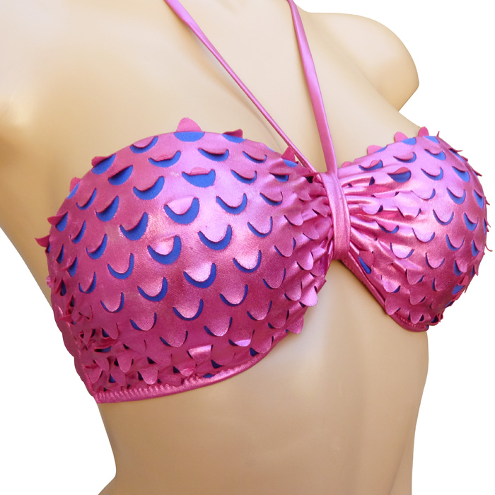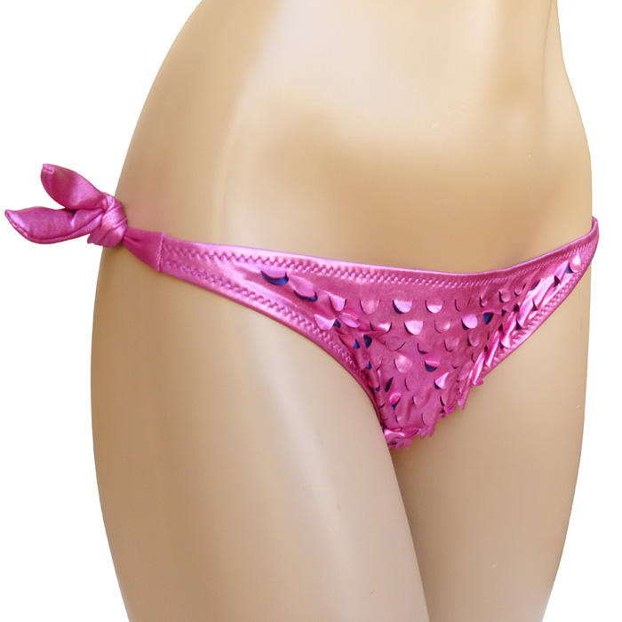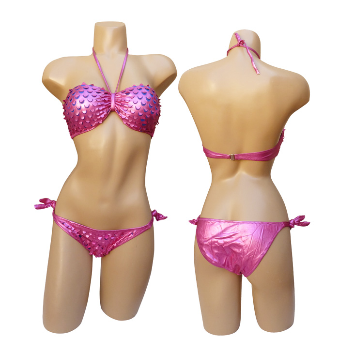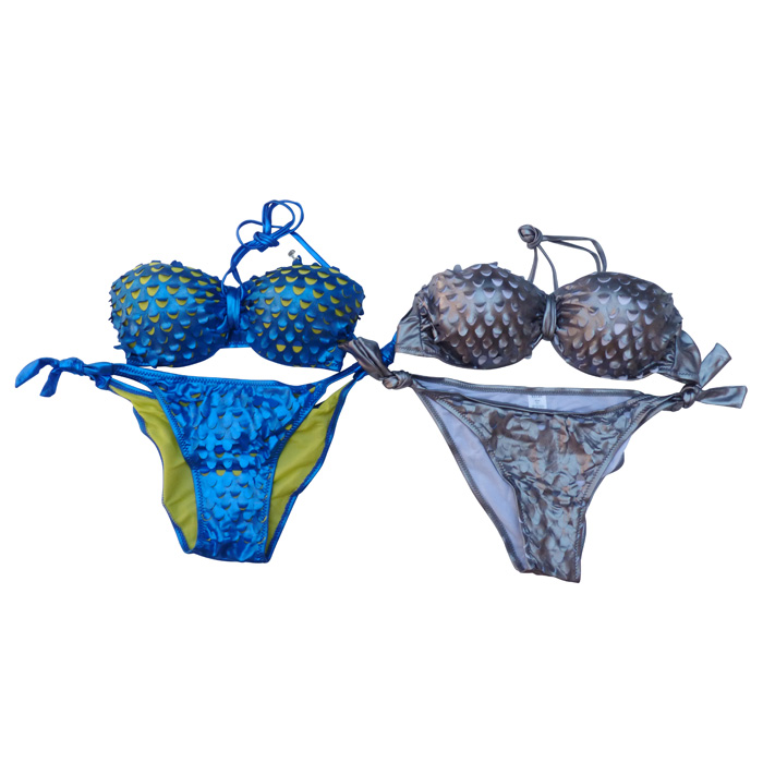 Maillot de bain 2 pièces avec slip. Soutien gorge coques, forme bandeau avec armatures Tissu brillant effet "écailles". Attaches clip au dos, liens à nouer dans le cou- Slip entièrement doublé avec attache sur les côtes, rappel tissu brillant avec effet "écailles". 4 tailles.