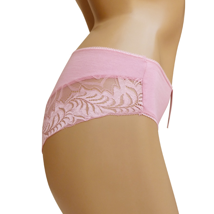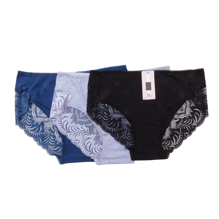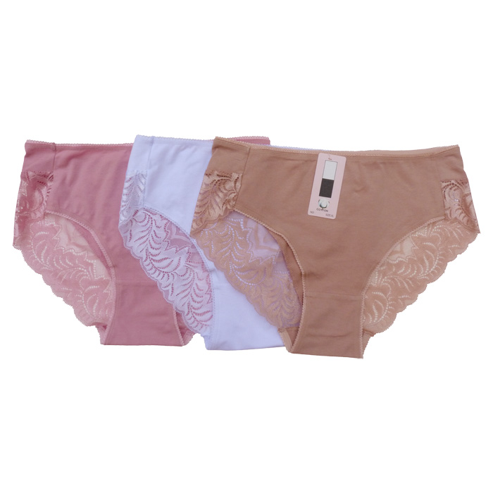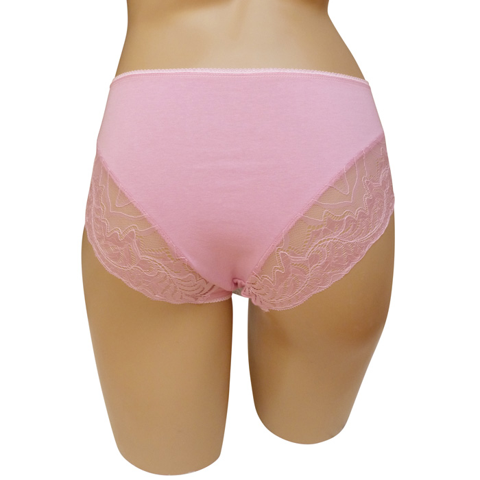 Slip, coton majoritaire. Culotte entièrement unie avec bande de dentelle sur le pour tour des cuisses à l'arrière. 2 tailles.