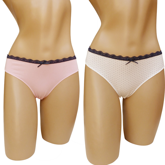 Slip coton majoritaire. Lot de 6 culottes blanc/pois marine et rose. Dentelle marine sur le pourtour de la taille. 2 tailles.