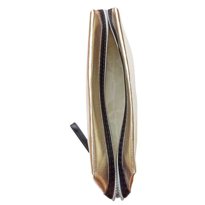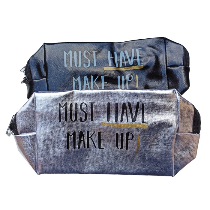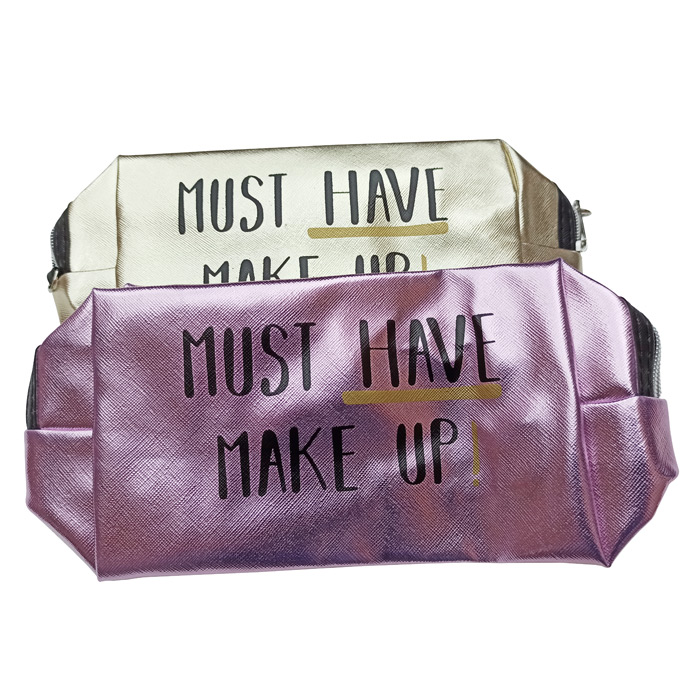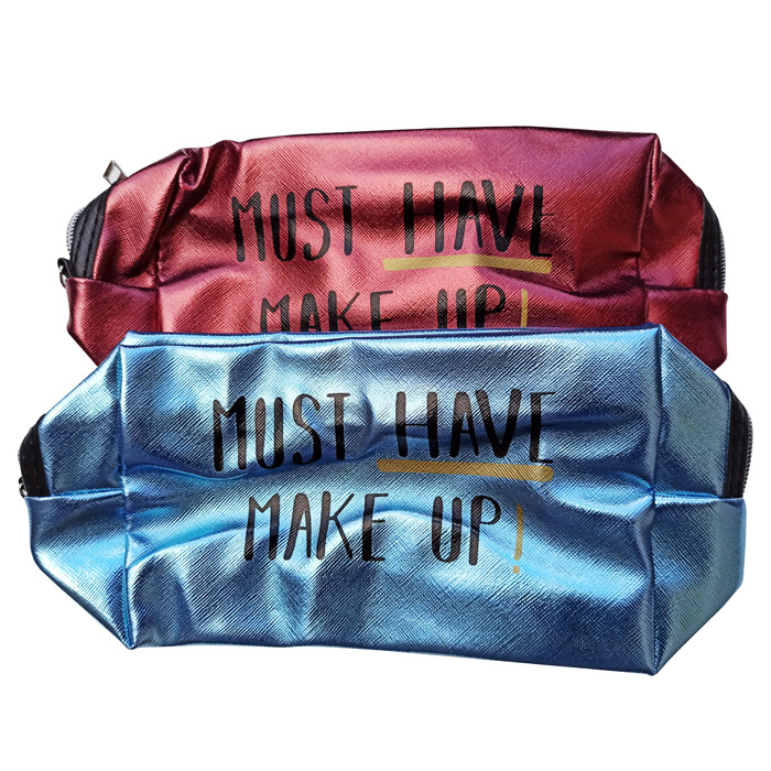 Trousse de toilette de différentes couleurs. Effet brillant avec inscription "MUST HAVE MAKE UP". Fermeture éclair sur le haut. Hauteur=26cm, Largeur=12cm , Base=7cm.