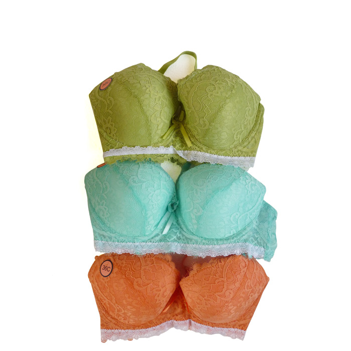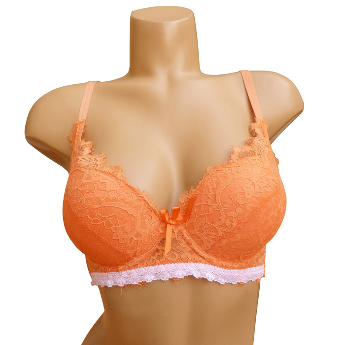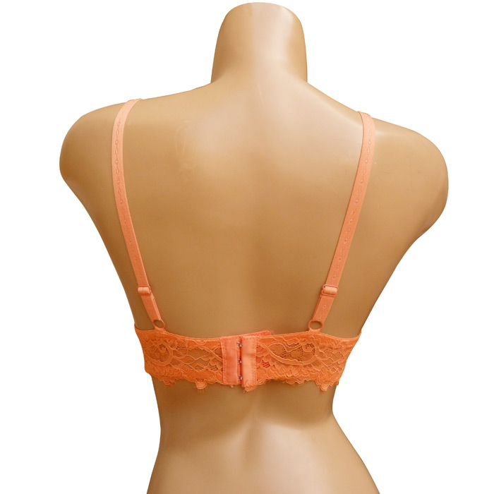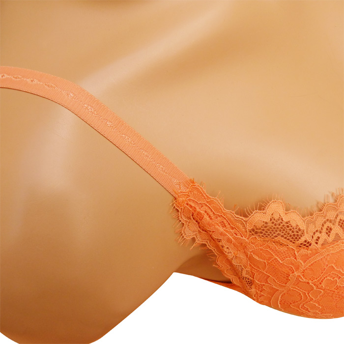 Soutien gorge, rembourré avec armatures. Fleurs brodées sur maille filet stretch. Bande de dentelle blanche sous poitrine. Partie inférieure, petites franges ton sur ton sur le pourtour. Brides réglables et non amovibles. Fermeture dos par 3 agrafes 3 positions d'accroches. 6 Tailles de 80C à 105C.