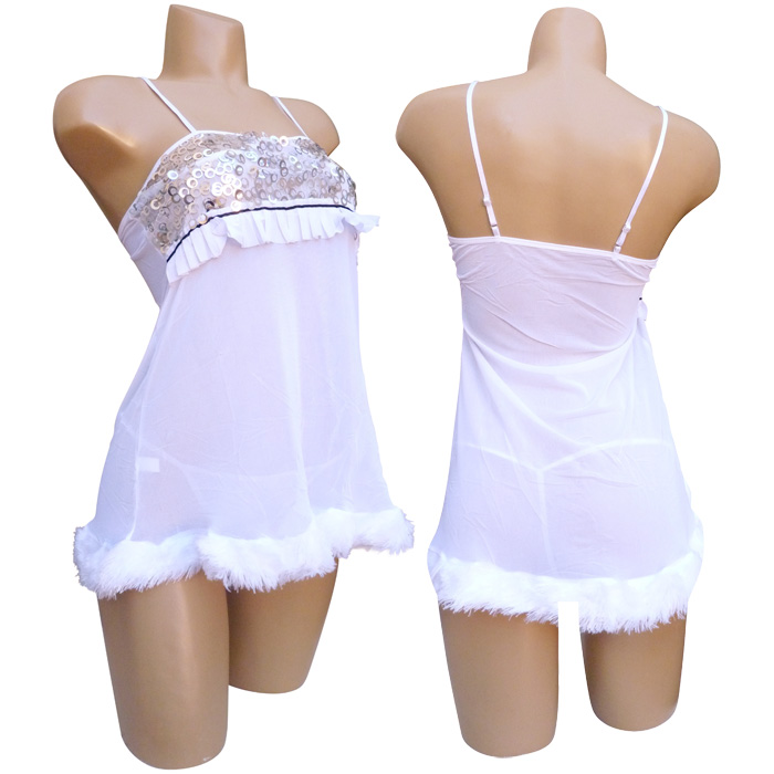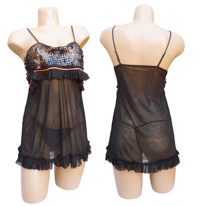 Nuisette courte sur voile stretch. Nuisette avec paillettes sur le haut de la poitrine. Volants sur la poitrine et sur le bas de la nuisette. Forme évasée. Dos élastiqué. Brides réglables. Taille unique.