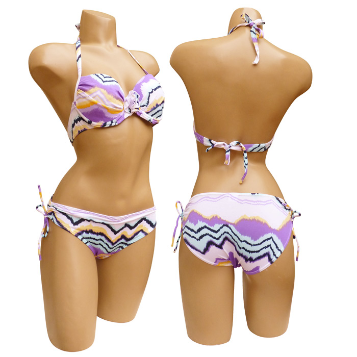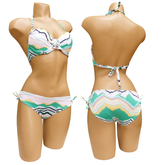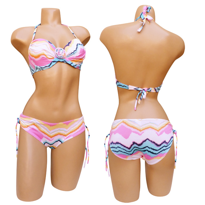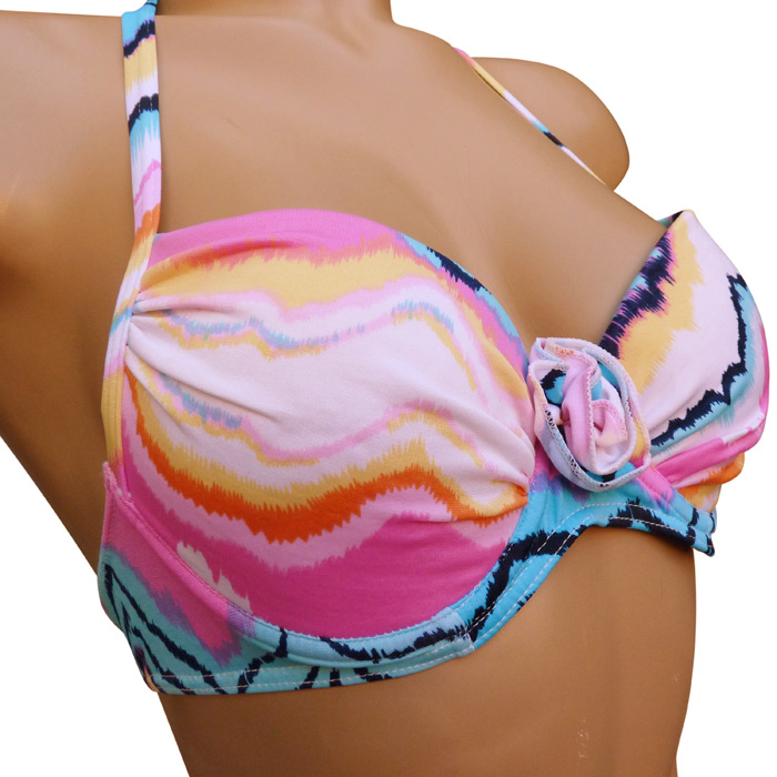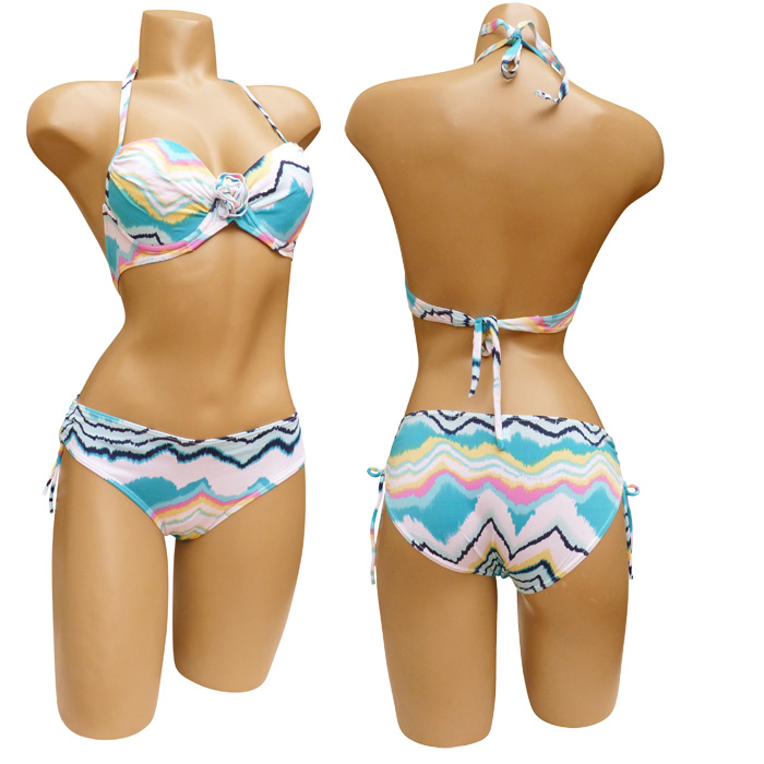 Maillot de bain 2 pièces avec slip. Soutien gorge, coques souples, forme bandeau avec armatures. Soutien gorge à nouer façon foulard au cou et au dos. Nœud fantaisie (en forme de rose) entre-bonnet. Imprimé graphique sur l'ensemble du maillot. Bas du maillot doublé à l'avant avec rappel imprimé sur l'ensemble du maillot, lacet de resserrage de chaque côté du slip. 3 tailles.
