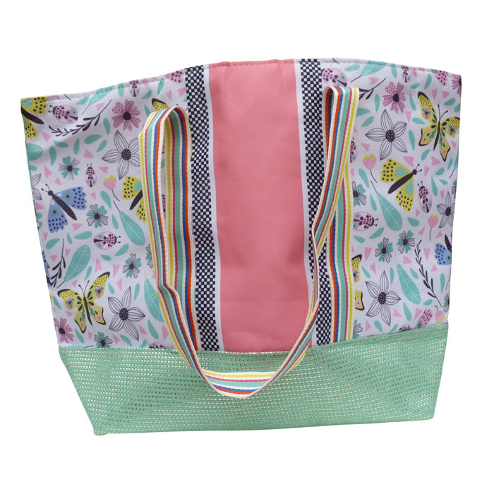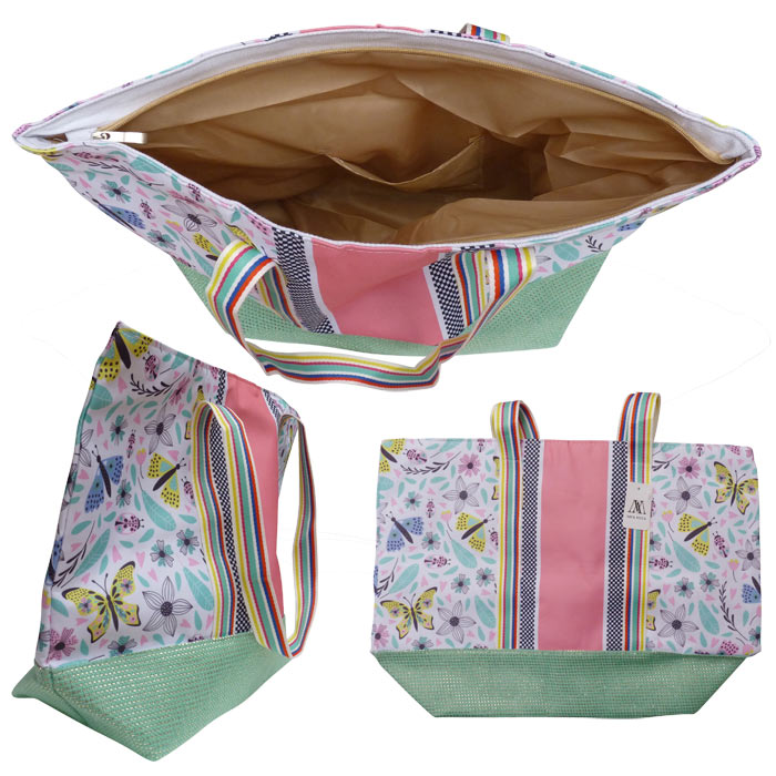 Lot de 6 sacs de plage fermeture éclair sur le haut. Fond du sac Doublé, avec petite poche sur le côté. Imprimé différents motif "fleurs, feuilles, plantes colorées...etc". Anses de couleurs multicolores rayés. Hauteur=36cm, Largeur=51cm , Base=16cm.