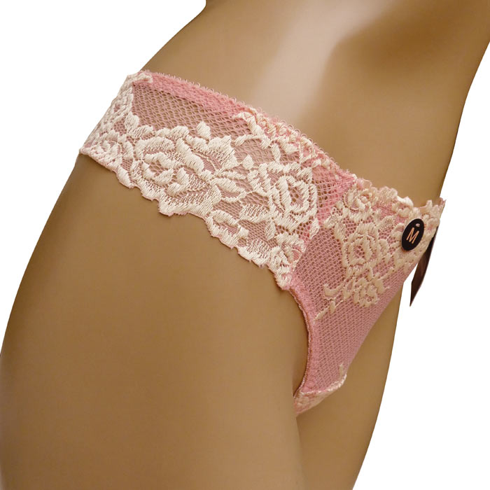 Ensemble soutien gorge Rose/vanille avec tanga. Soutien gorge bonnet C avec armatures. Soutien gorge coques souples, broderie sur maille filet stretch sur l'ensemble des bonnets. Brides réglables et non amovibles. Tanga en dentelle rappel broderie "fleurs brodées". 4 tailles.